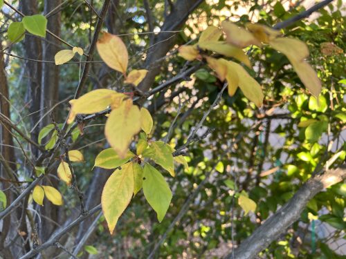We have one fruit tree (peach, maybe?) which has never borne fruit in the 5+ years we’ve been here, but the leaves do turn yellow and fall off in the fall.