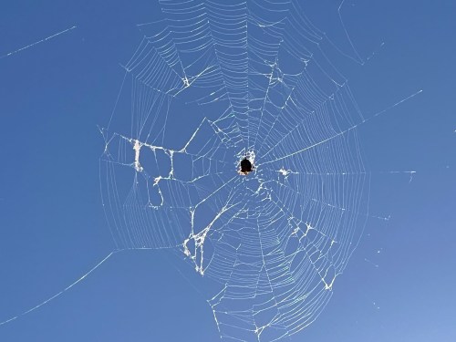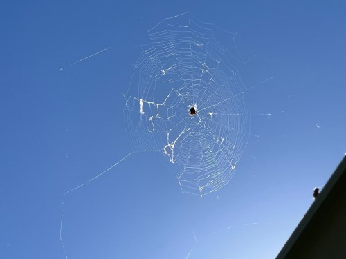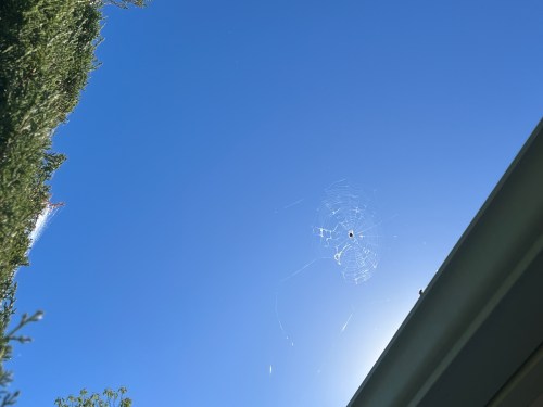 A couple of days ago, near sunset, as I was taking trash out to where the bins are on the side of the garage, I noticed a single thread of spider silk floating overhead. It was connected to the garage room about 10 feet up, the other end anchored about 15 feet up to the Italian cypress trees next to the driveway. Along the line I could see a single large-ish spider working. I’m no expert on spiders by any means, but I think it’s an orb weaver?