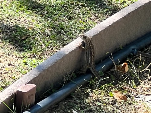 While the lizards love the sun, they more like just being warm, and if that wooden edging piece is in the full sunlight it gets toasty, so they can snuggle up against it and hug it like a giant body pillow, sucking up infrared photons through their little, blue bellies.