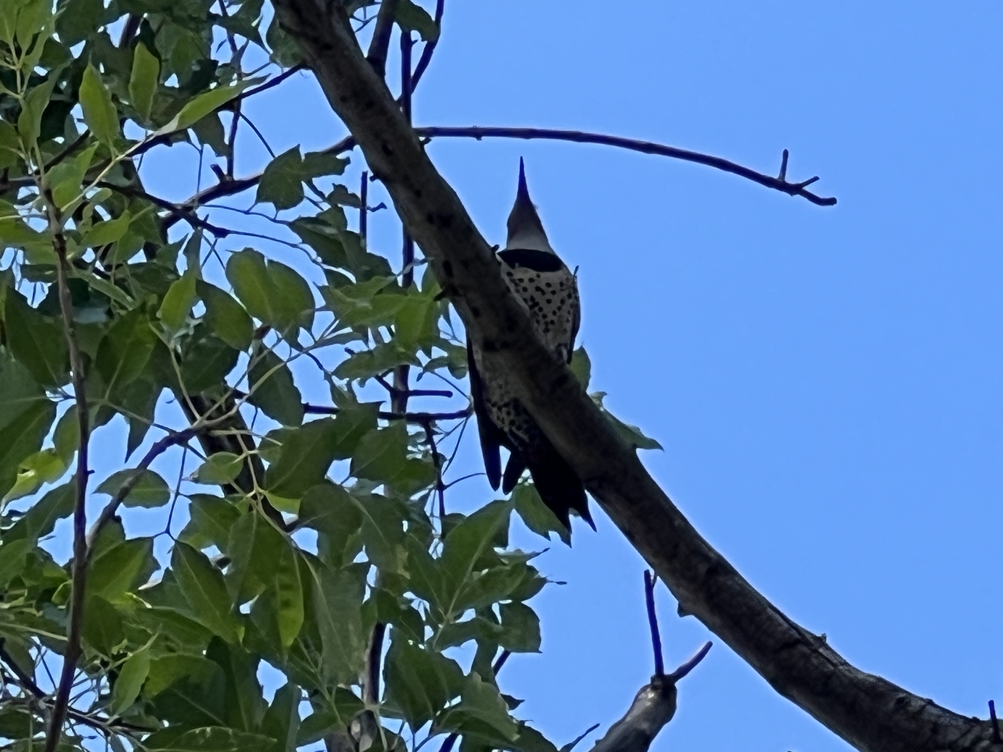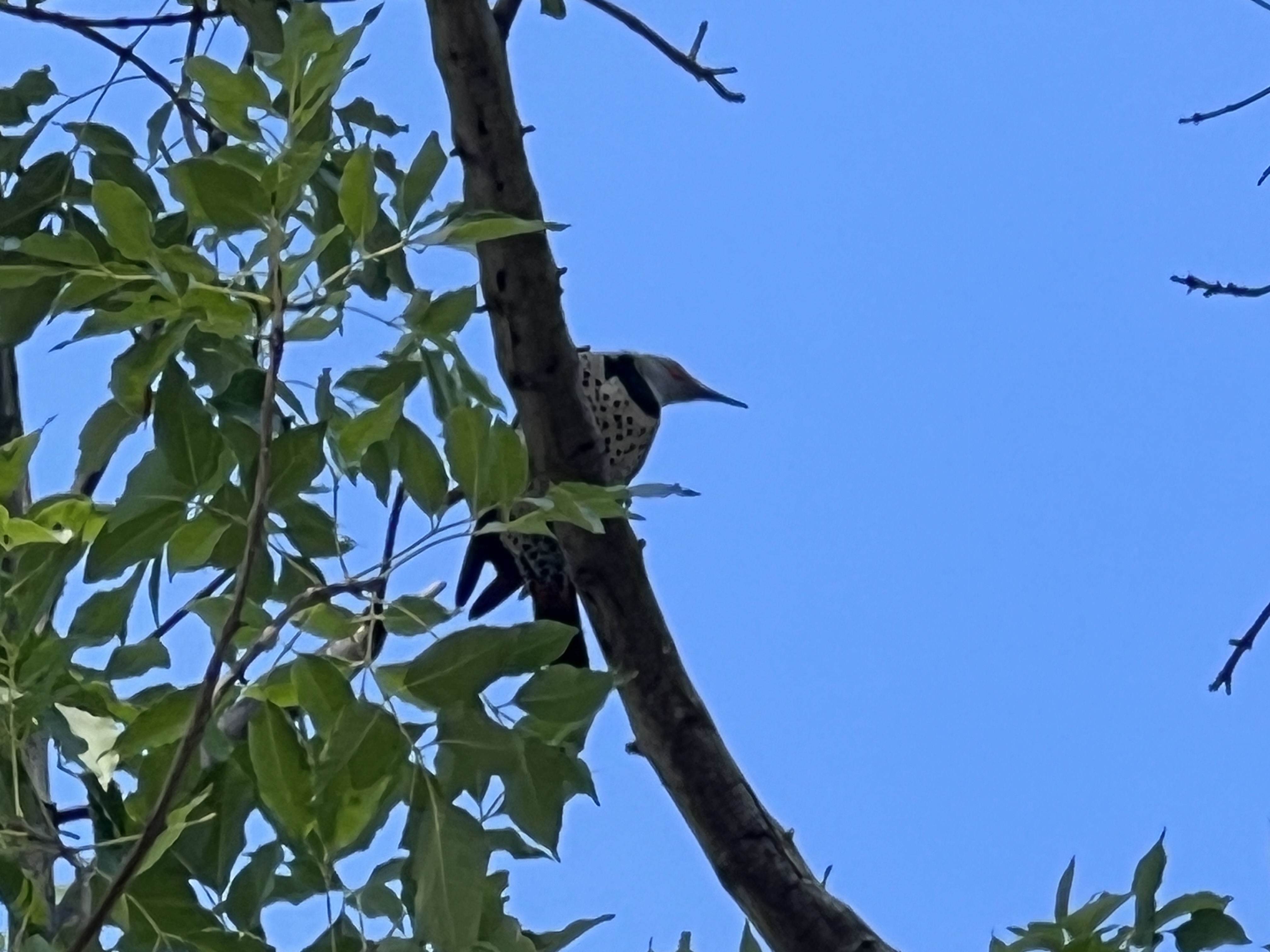 The yellowish belly with all of those spots! That black, crescent-shaped arc under its chin! It’s our red-shafted Northern Flicker, back for a refill of SoCal bugs, and I have just the dead branches for it!