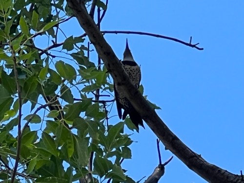 See it? Neither did I. But what I heard was a tapping or knocking sound directly overhead. I thought it might be one of the downy woodpeckers we see here every once in a while, but nope! Just above center, on a bare branch, is a much larger bird.