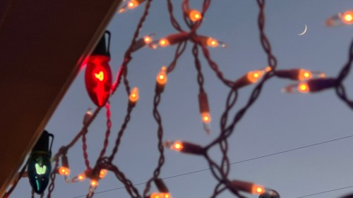 This was a tough shot. The Moon was far away and tiny (relatively), the Christmas lights about 18″ away and big (relatively), and the iPhone naturally wanted to focus on the Christmas lights. But I remembered reading about how to lock the focus on the iPhone and played with it a bit to see if I could get it to work. And it did!