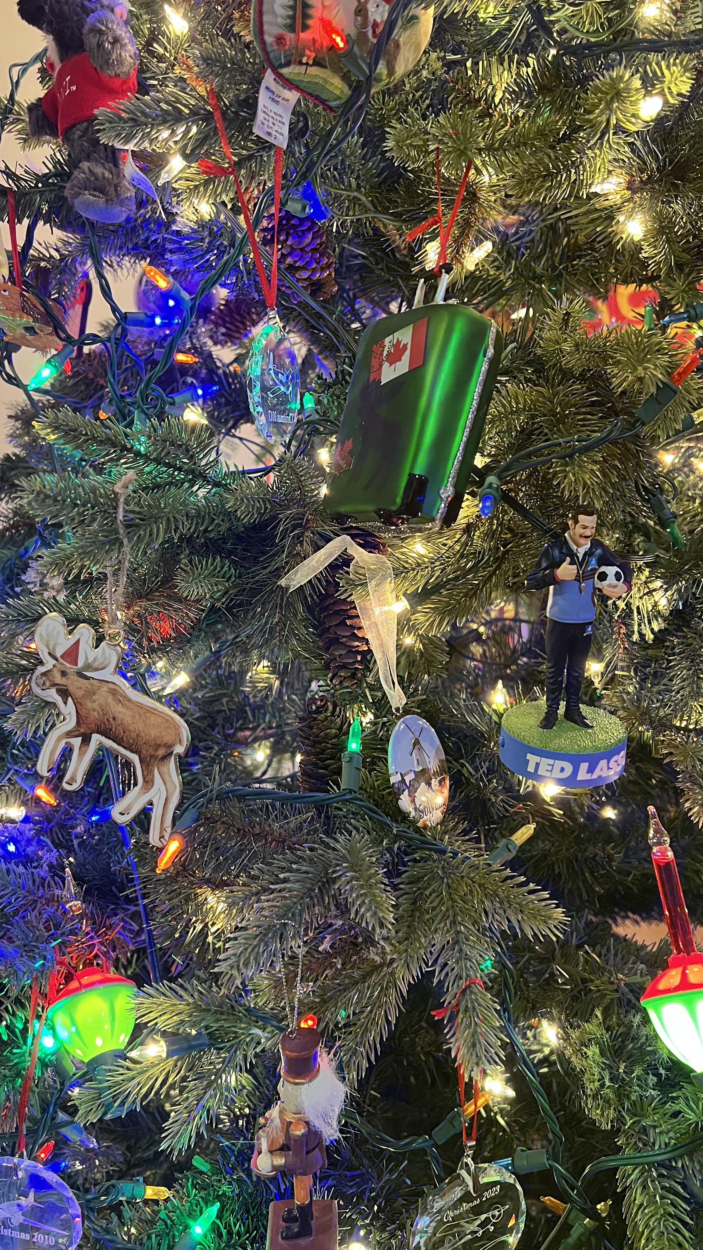 This year’s new ornaments include a couple from our trip to Winnipeg, one from the Chiefs’ Super Bowl victory, one from a trip up the California coast to Solvang, and a talking Ted Lasso from a dear friend.