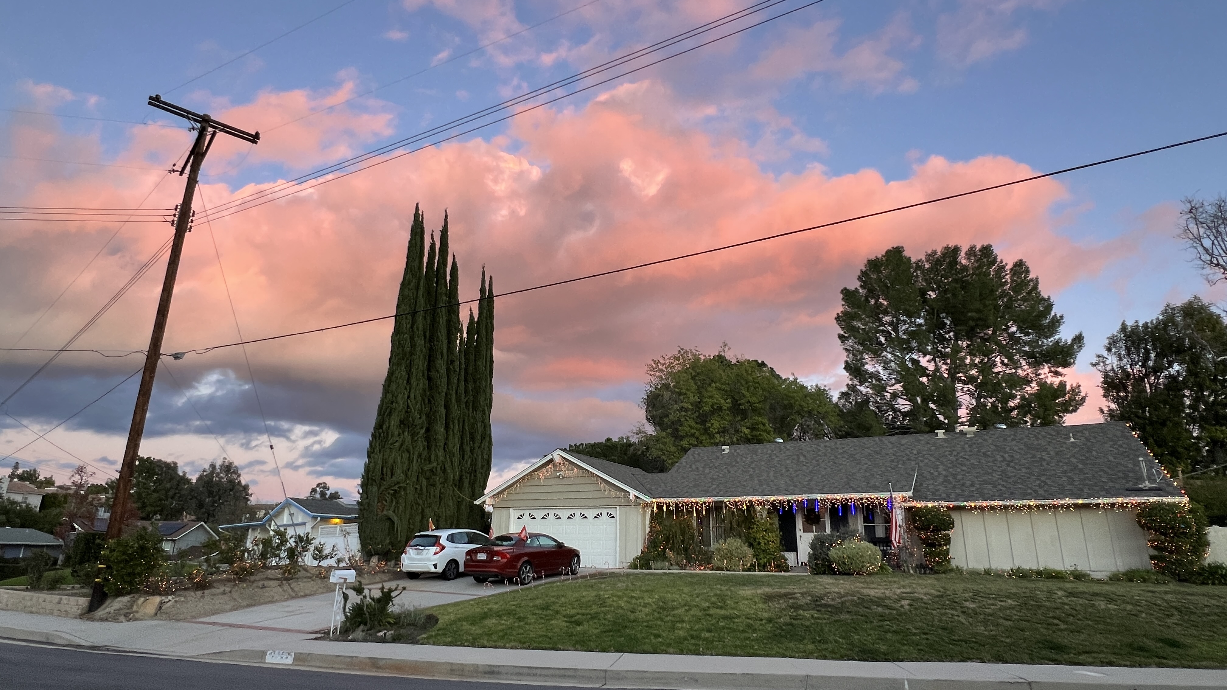 Ah, there it is! I crossed the street and found all of the clouds piled up over LA County and the Santa Monica Mountains, and they were a very nice selection of shades of pink, orange, and red.