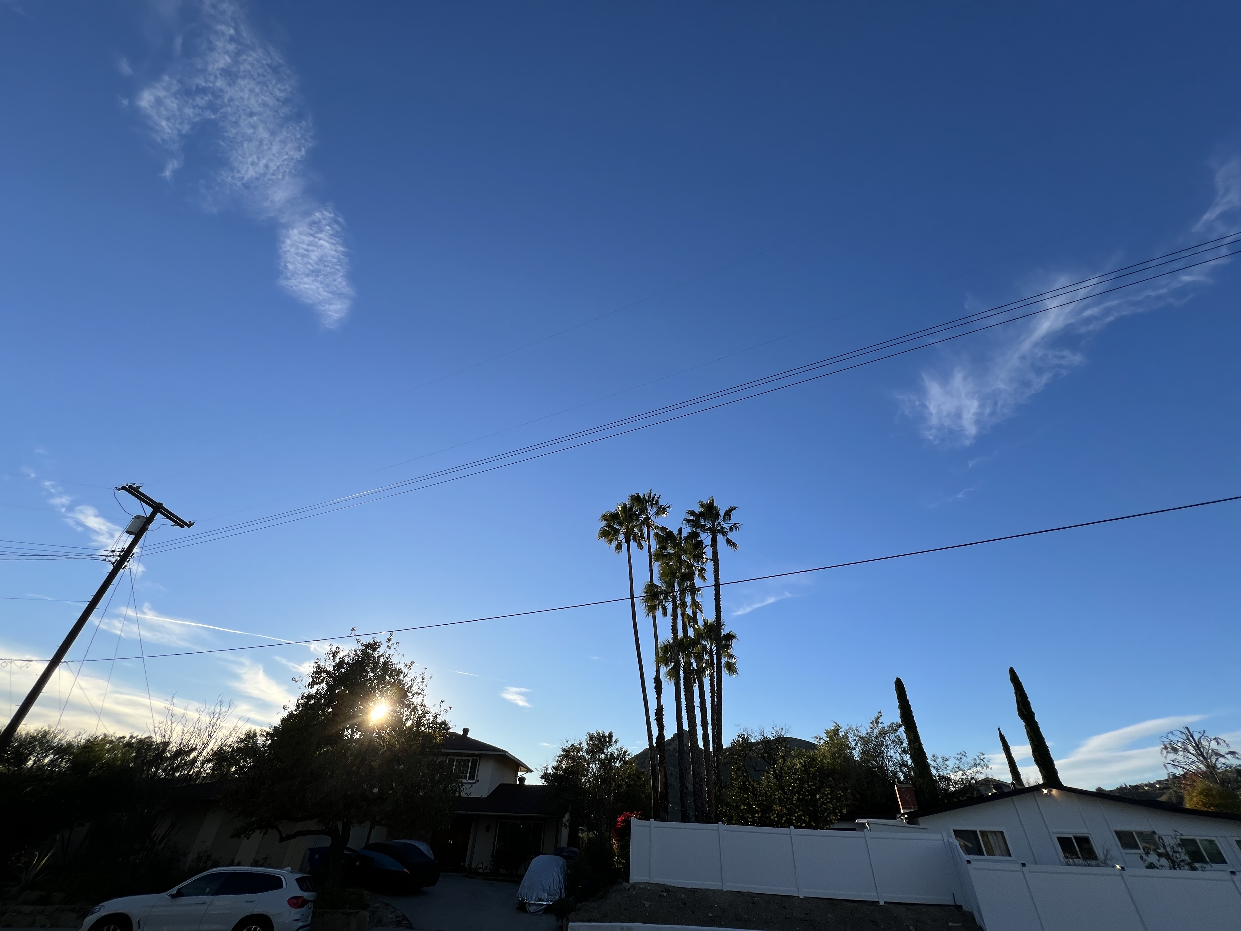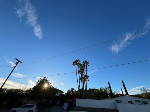 See those two tall, thin, phallic Italian cedar trees on the right? Falcon 9 will rise just to the left of the left-hand tree, arc up at about 45º behind that stand of palm trees, have first stage cutoff, stage separation, and second stage ignition just to the left of the palsm, and then go over that telephone pole about halfway between the top of the pole and the top of the picture. From there it will arch back all the way to the southern horizon off to the left.