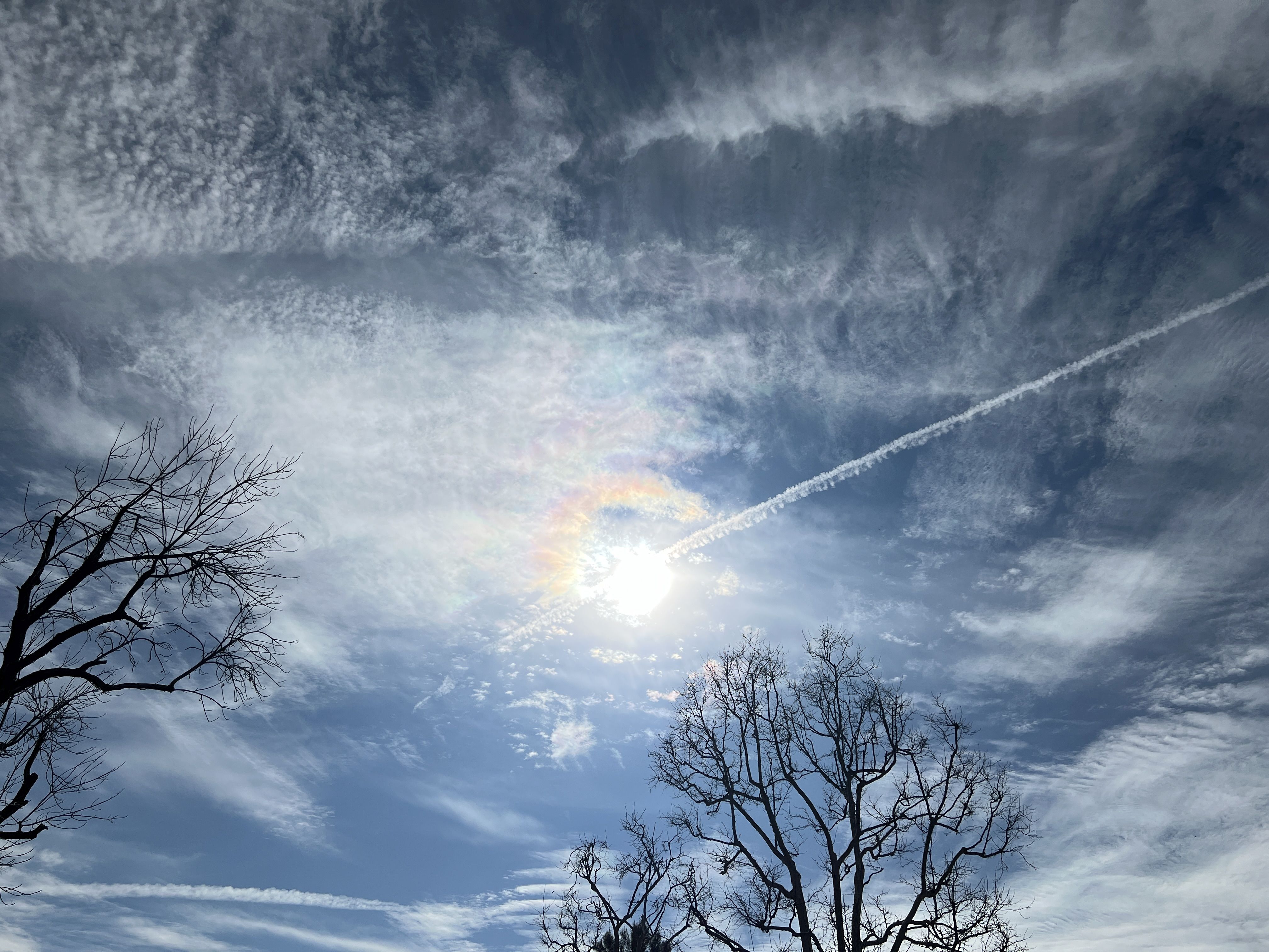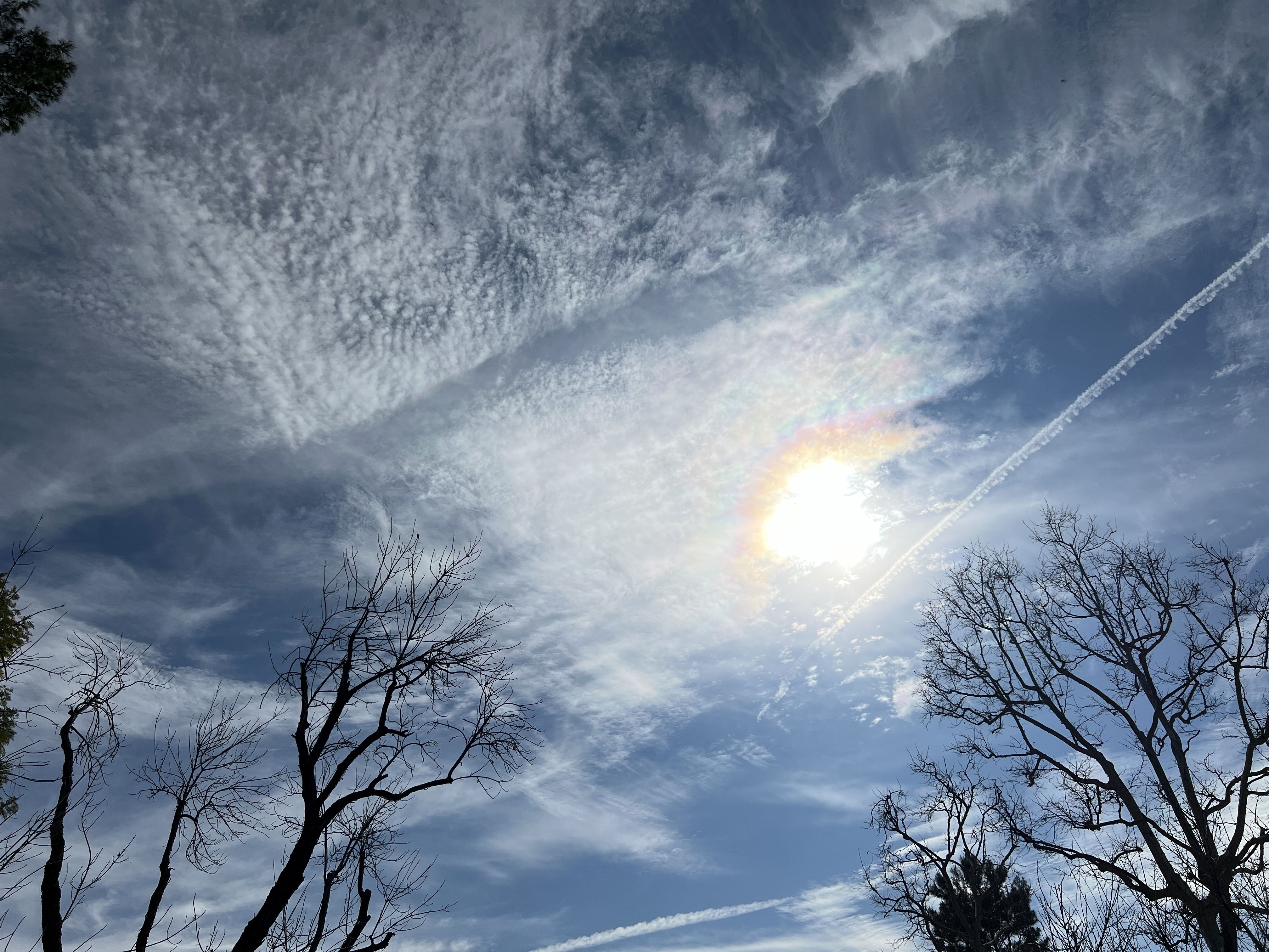 It was somewhat sunny and warm, which will be ending tomorrow as we get ready for another week or more of heavy rain, so I went out this afternoon and saw some fantastic clouds, contrails, and a bit of iridescence as the Sun shown through a high layer of clouds.