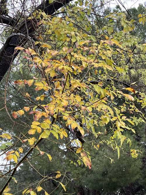 This particular tree will lose a bunch of leaves in the winter, but never all of them, and they never turn colors. They may fade a bit from bright green to a more pale green, but that’s it. Then they fall off. And the tree looks like this.