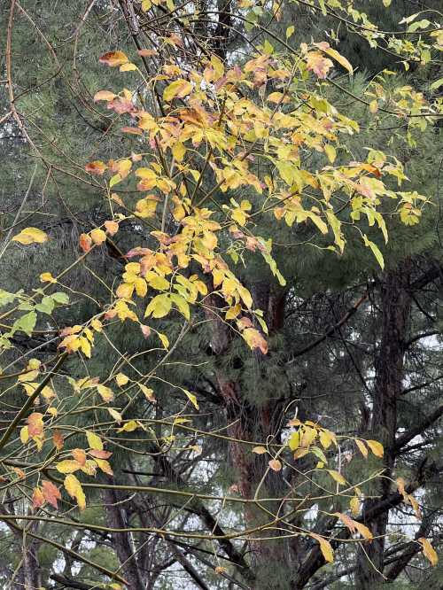 It’s pretty in a subtle way. Yellows and browns and greens with just a touch of reddish shades here and there. And in the grey, rainy, gloomy, damp lighting of mid afternoon, it stands out.