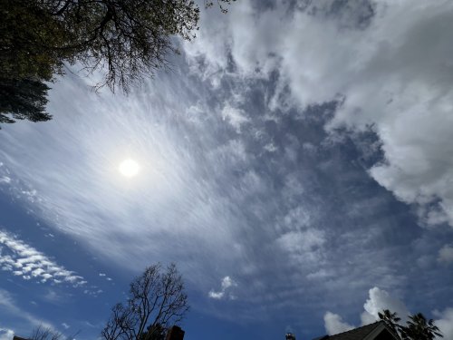 These guys over here already developed an altitude and they’re just blocking a touch of sun. (Eventually the lower, thicker clouds blew off toward Las Vegas and rained there.)