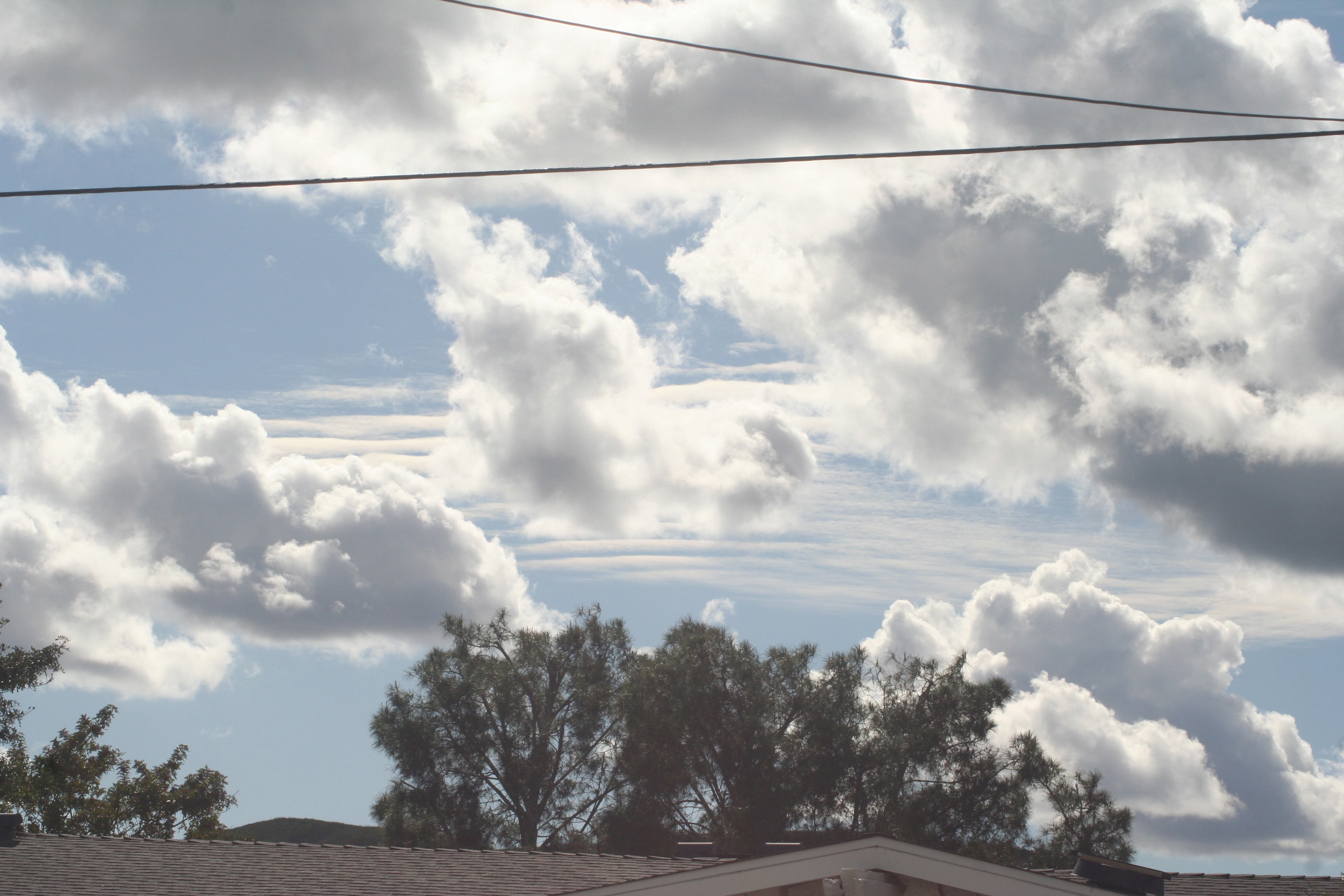 I didn’t say I always take good pictures. But in this case I wasn’t sure how long the phenomenon would be stable and visible, so ignore the wires and the puffy clouds in the foreground, and look at the nine or ten horizontal, parallel (-ish) lines of clouds beyond, somewhere out over Ventura County.