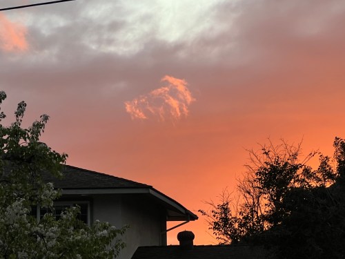 A stray late sunset, pink and orange ray of sunlight found a hole and poked through like a spotlight, catching them against the dark background of the thicker, unlit clouds off in the distance.