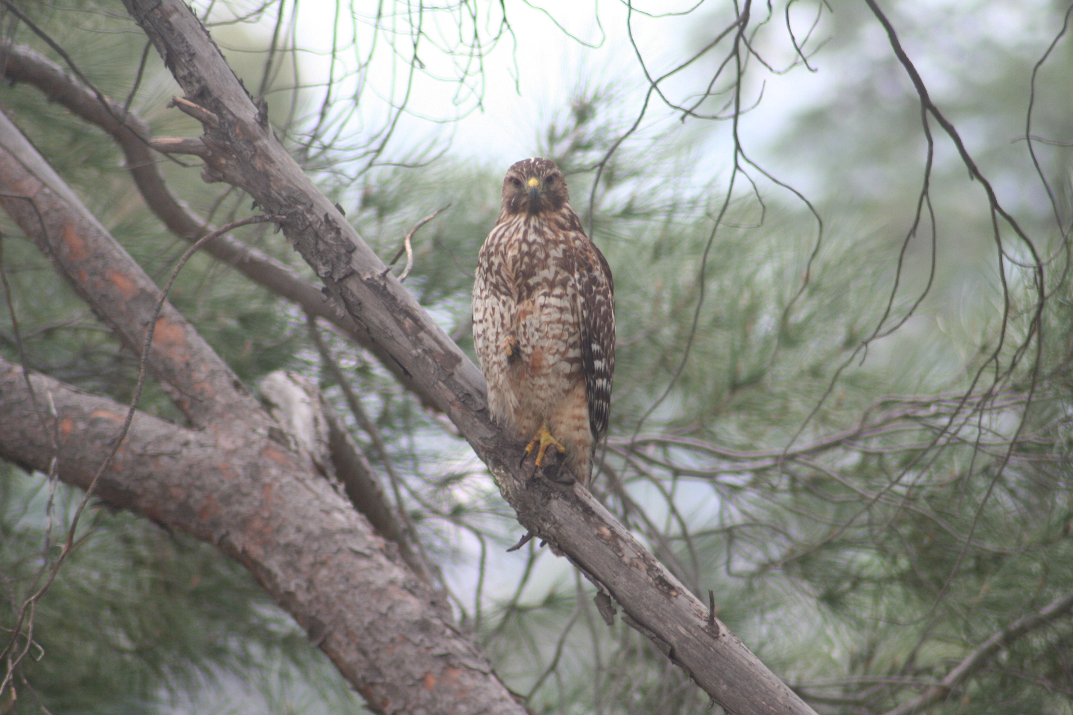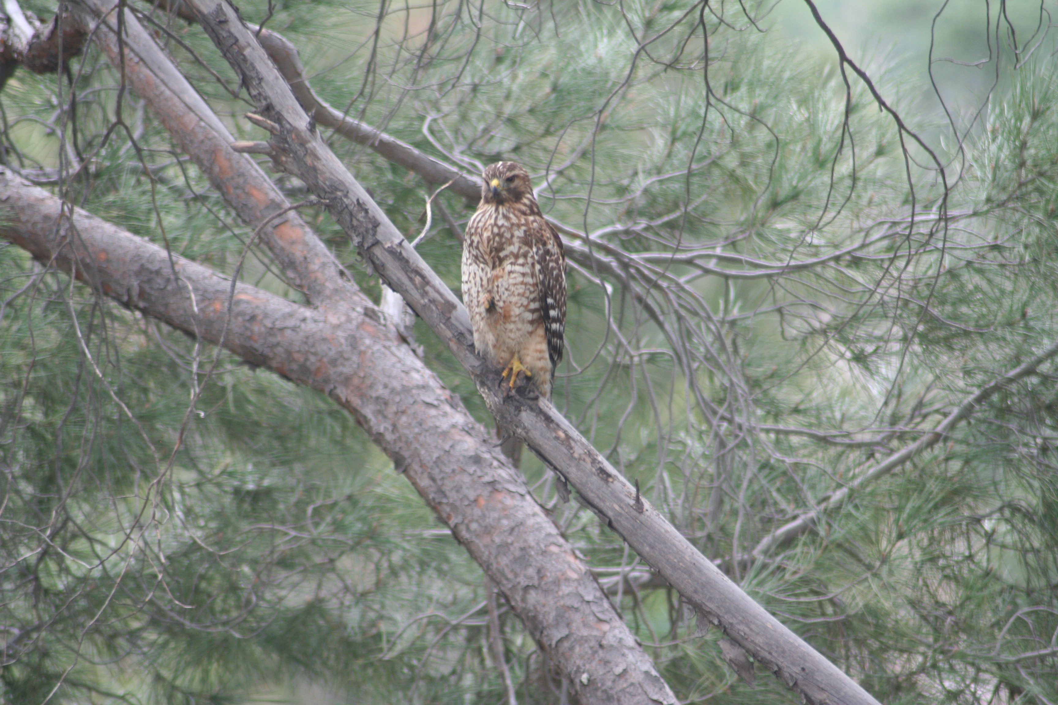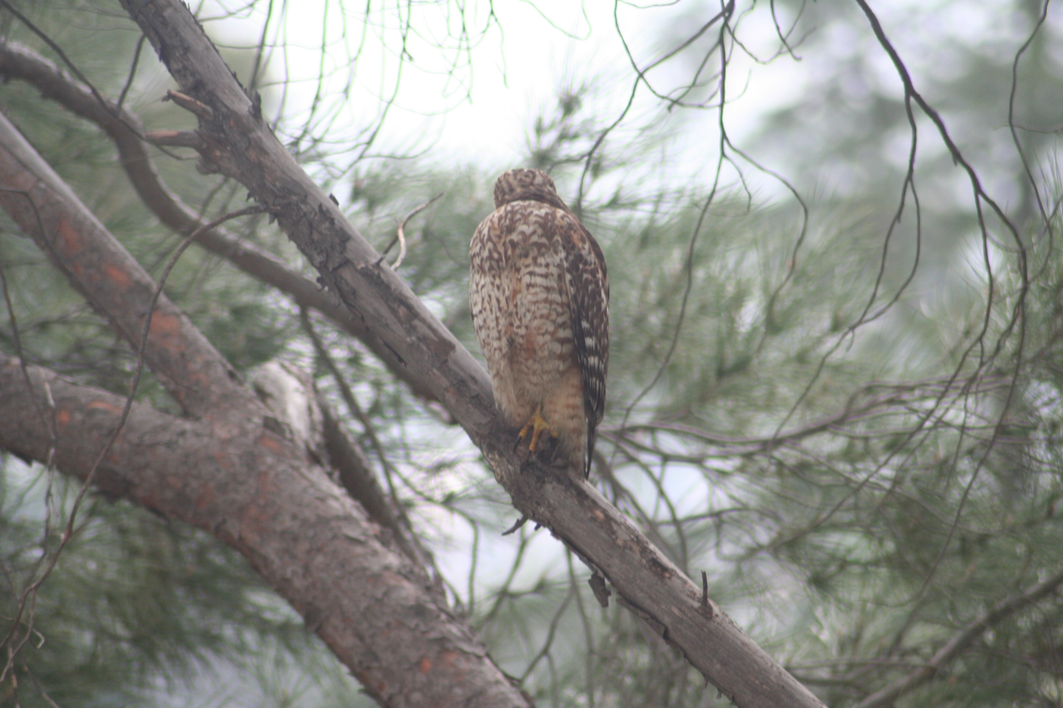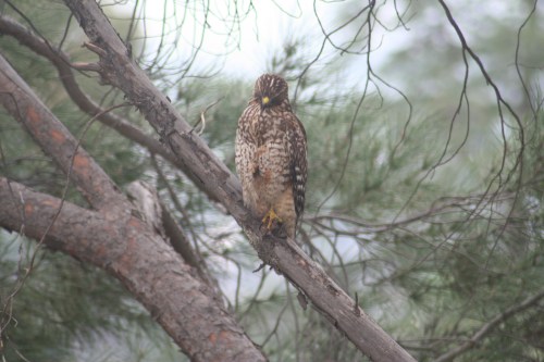 What a pleasant surprise today! I was taking a quick break and grabbing a soda in the kitchen when I saw something large-ish going through the pine trees on the slope beyond the back yard. It wasn’t any mourning dove, much larger, some sort of raptor. I grabbed a camera and headed out into the rain.
