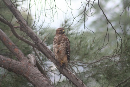 What kind of hawk is it? It’s a mystery, sort of. I ran four different pictures through the Merlin Bird ID app (from Cornell Lap, get it!) and all four said it might be a Cooper’s Hawk or a Red-shouldered Hawk. In either case it’s probably a juvenile, but that’s more likely if it’s a Red-shouldered Hawk. That’s my bet, simply because the Cooper’s Hawks that I’ve seen up close have solid brown or tan chests, where these patterns are more like the Red-shouldered Hawks. I could have positively ID it if it had sounded off, their calls are much different. But not a peep was heard.