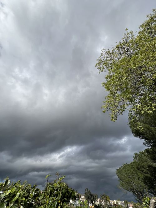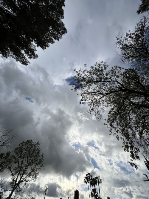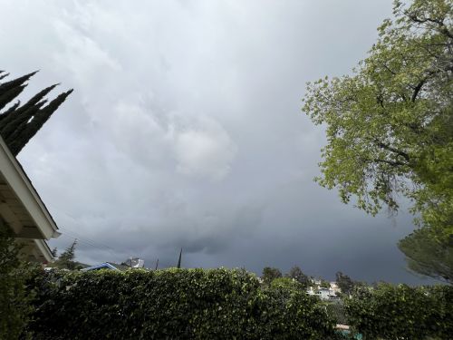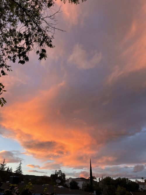 19:11 – We get more alerts about “our” thunderstorm cell being a danger to mariners out over Santa Monica Bay to our south where it’s drifted, but off to the north we’ve just got a lot of broken clouds and a highly unstable atmosphere. This however is great for getting a spectacular sunset. With more rain directly west of us, the normal view we have of the pink and golden clouds behind the grove of silhouetted palm trees is grey and gloomy and dark, but looking to the side from the back yard it’s bright and colorful.