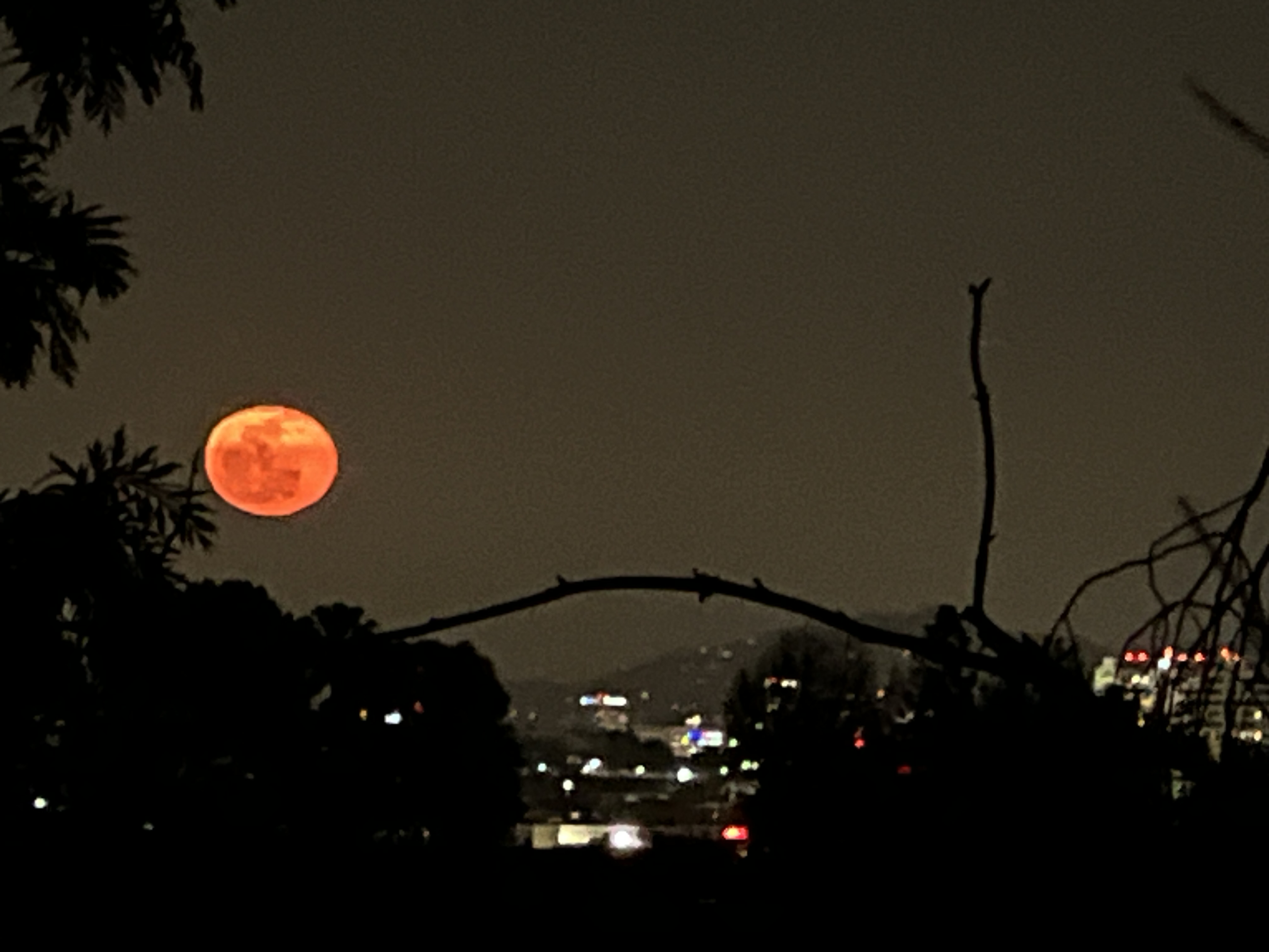 Take a moon a quarter the size of it’s primary planet, put it out a quarter million miles, let angular momentum and four and a half billion years roll by, and it ends up right there tonight, headed for right THERE in twelve days and thirteen hours. Mix in an atmosphere, some haze and fog, diffraction, refraction, Reyleigh scattering, and you end up with a weird looking arc of bright orange peeking over the horizon.