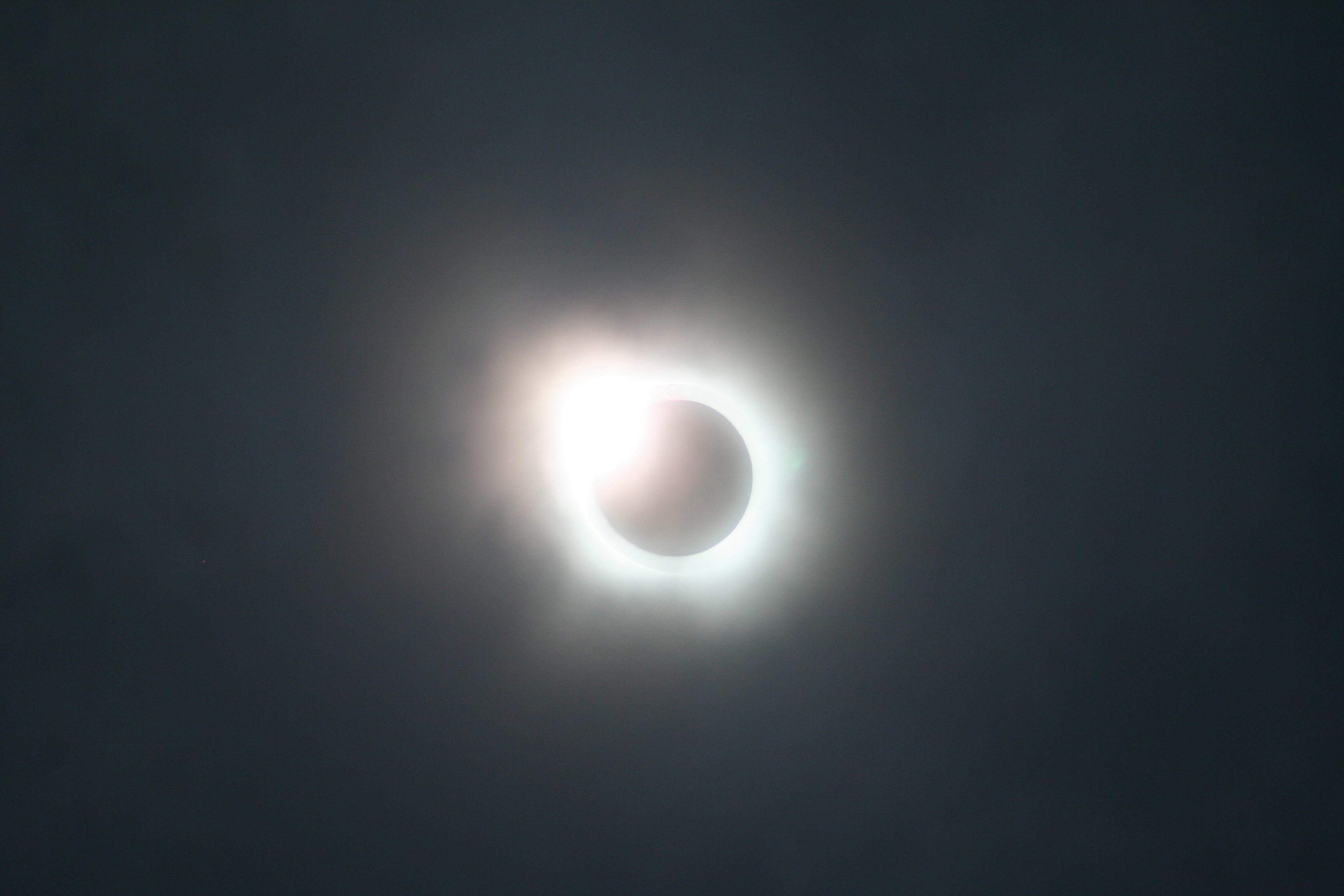 Still a handheld photo, still with the camera seeing a dark sky and waaaaay overexposing the corona. If we had gotten the entire 4:24 of totality I’m sure that I would have had the time to check the pictures I was getting, realize what was wrong, and fix it. As it was, we all knew that the clouds would move back in any time. I was just taking pictures as fast as I could because I was quite sure that I didn’t have much time. I was, unfortunately, correct.