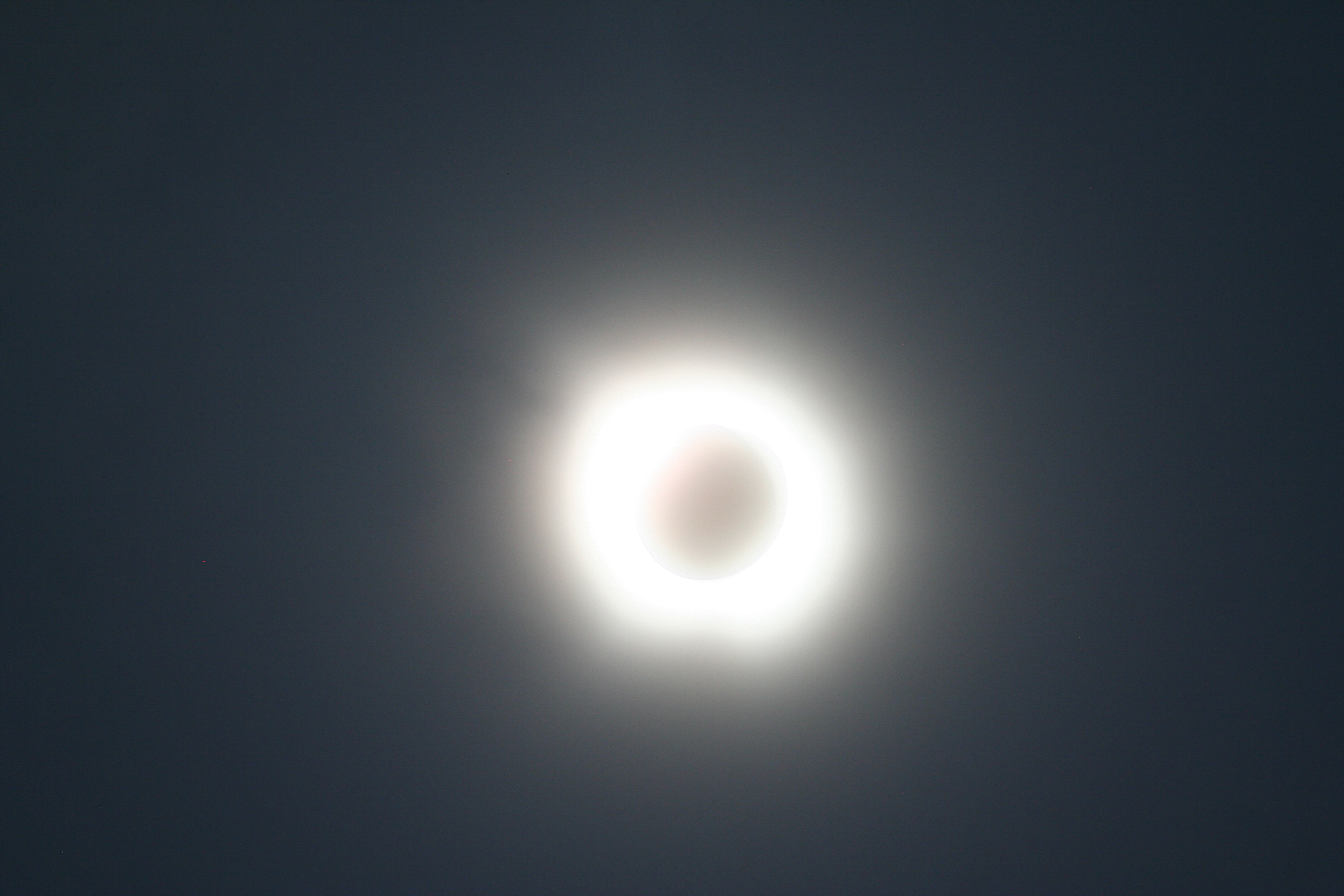 It was freakin’ glorious. While the photos may not have turned out as well as I had hoped, looking at the fully eclipsed Sun through the telephoto lens was spectacular. There wasn’t a ton of detail visible like you’ll see in any of the truly amazing pictures where folks had a clear sky. The clouds blurred out a lot of that detail. But the corona to my sight through the telephoto lens was a bright circle, razor sharp on the inside where the Moon’s surface was and spreading out over a “Moon diameter” distance in all direction with a fuzzy outer edge. I could not see any prominences or flares, but I could clearly see that the inner edge had a pink and red tint to it.