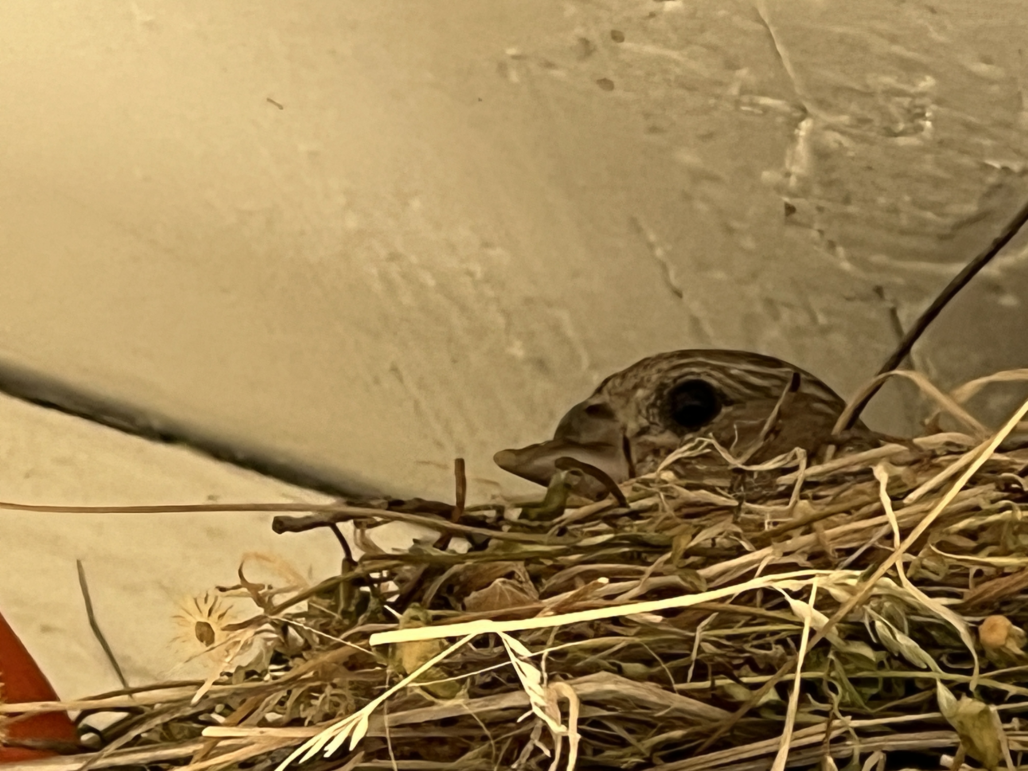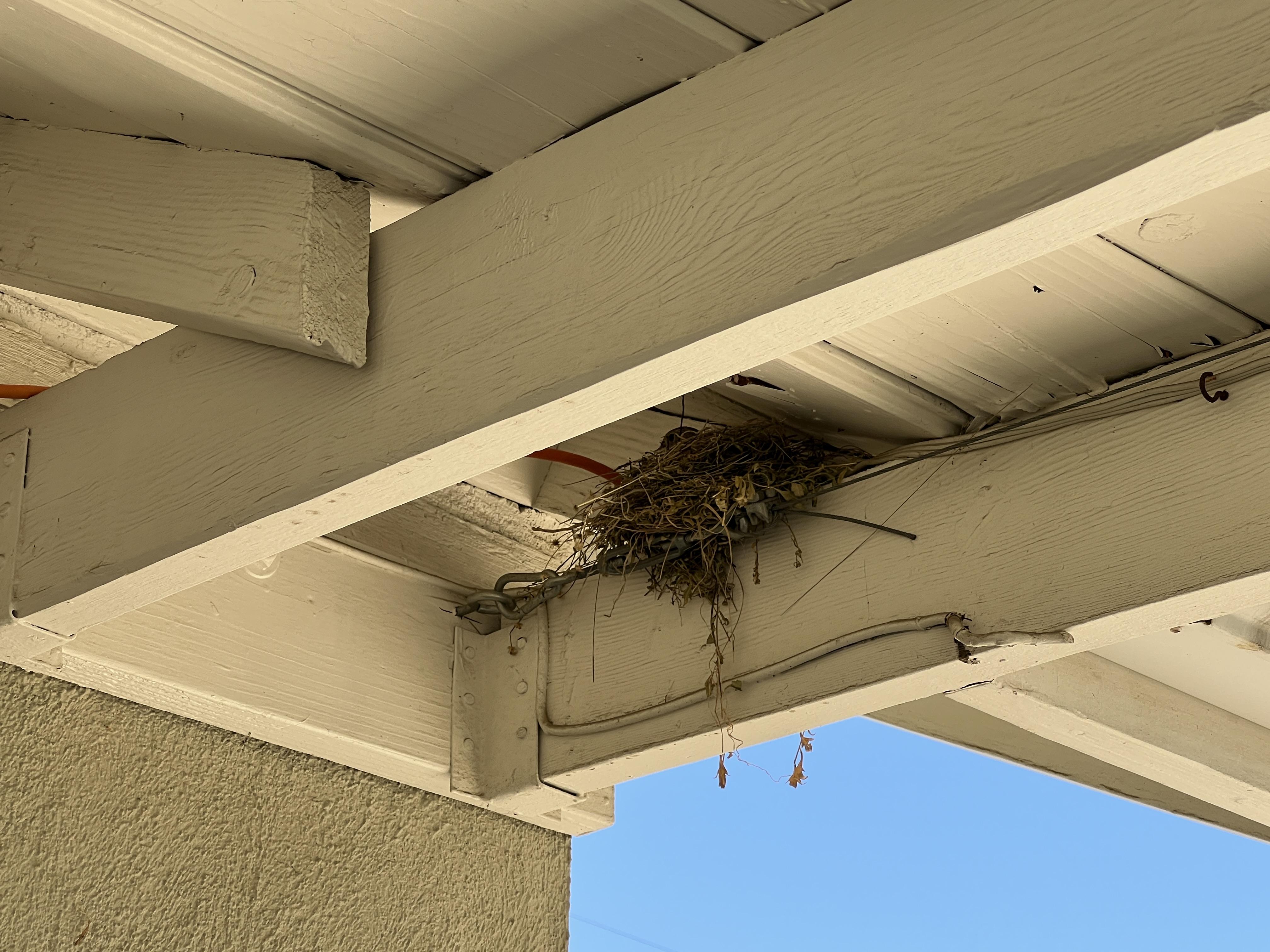 Today however I noticed a bird staying in the nest even when I came outside (this is right above the sliding glass door) when in the past they’ve flown off instantly, so I’m guessing there are eggs in the nest now.