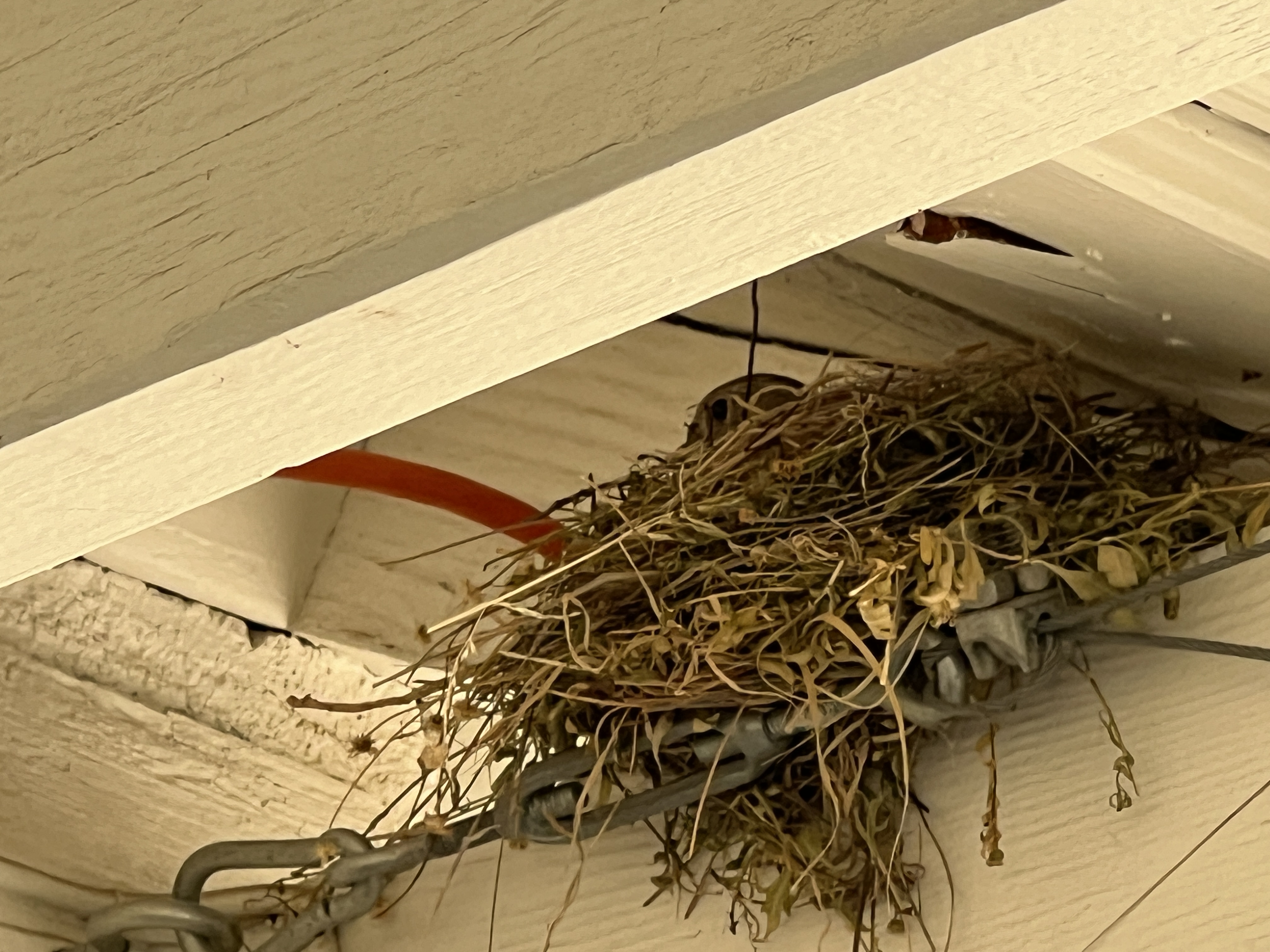Most years we’ve been in this house we’ve had nests out on the porch, usually house finches, sometimes mourning doves and hummingbirds. This year is no different.