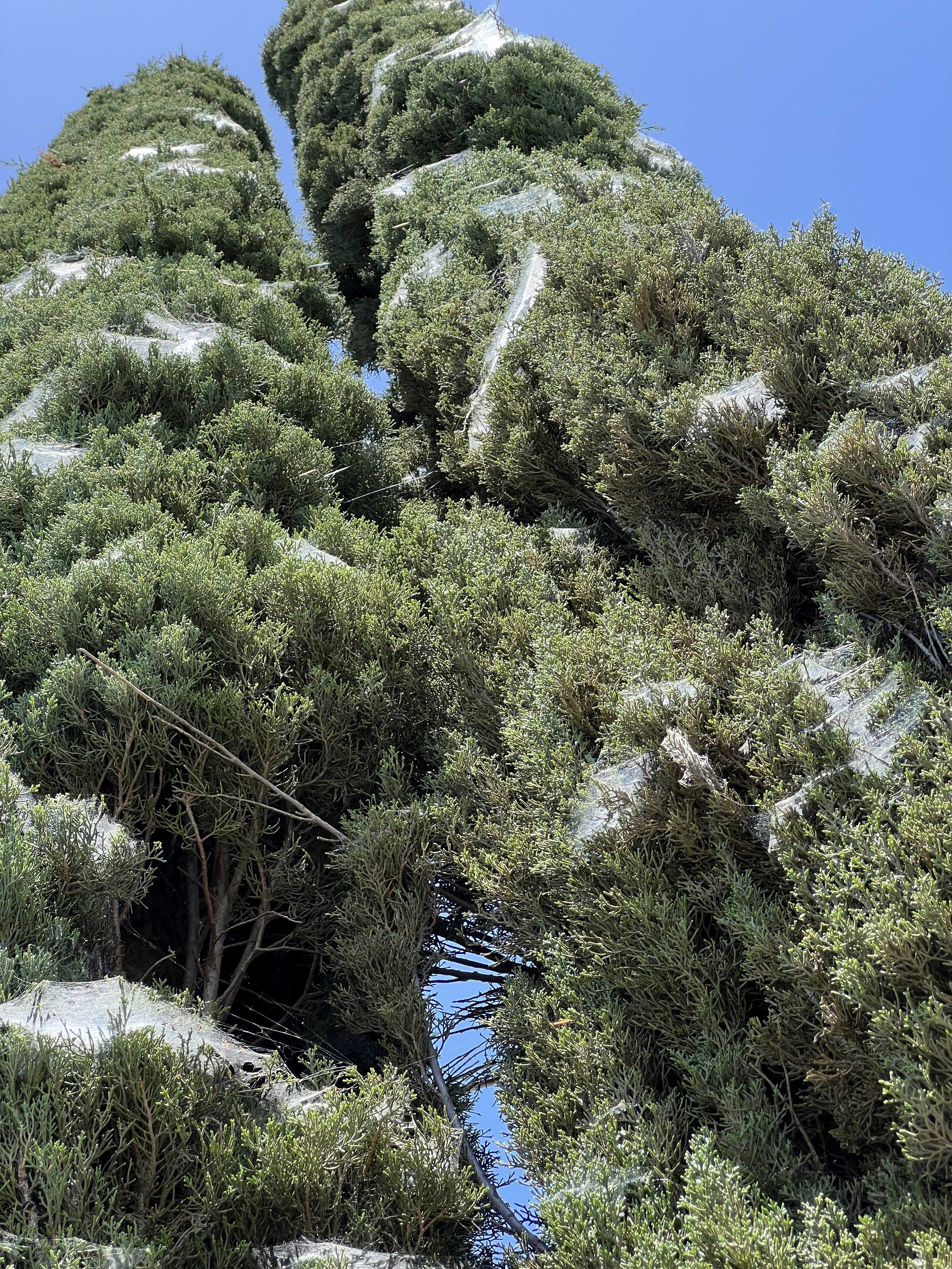 Bringing the trash bins in this morning, I found the Italian cypress trees covered in these little pockets of spider webs, one above the other.
