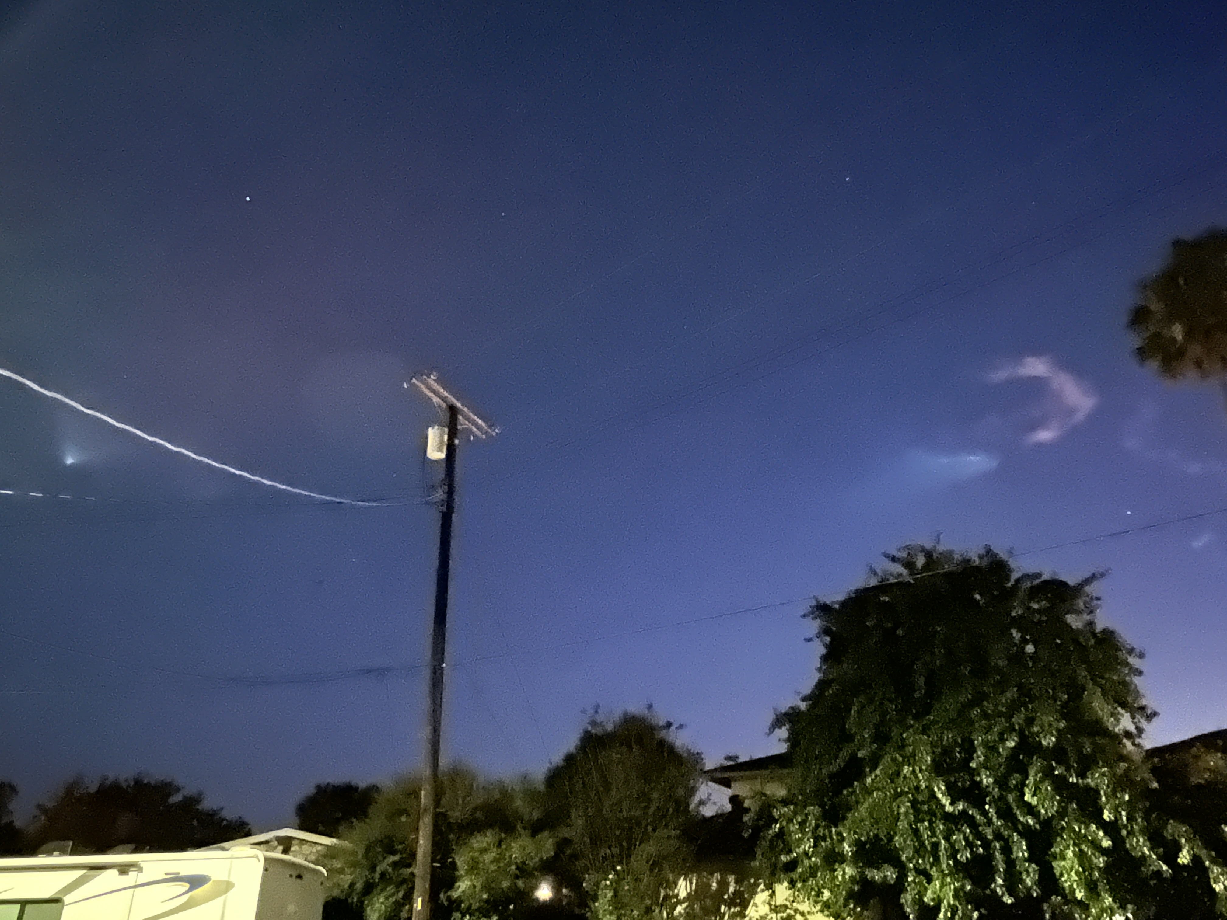 Named more for the SF series and movie, this was the 5th launch of the Alpha launch vehicle from Firefly Aerospace. You can see the orangish trail coming up behind the palm trees on the right, lit by the Sun somewhere far over the western horizon, while above the telephone pole on the left you can see the second stage heading south to orbit (it got there successfully!) with the just separated first stage falling back behind it, venting excess fuel.