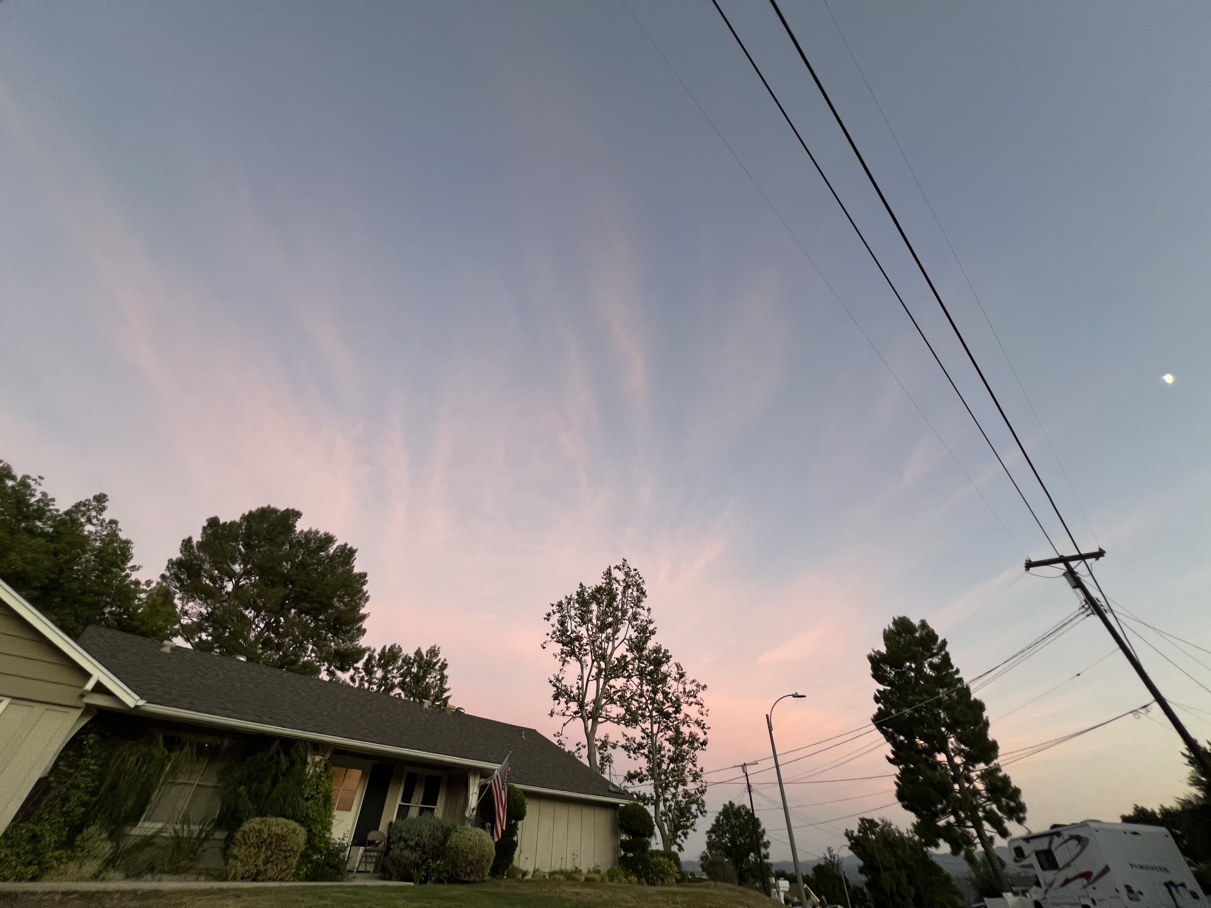 Just before 20:00 local time, about fifteen minutes after sunset, there were some high, thin clouds overhead that were tinged pink.