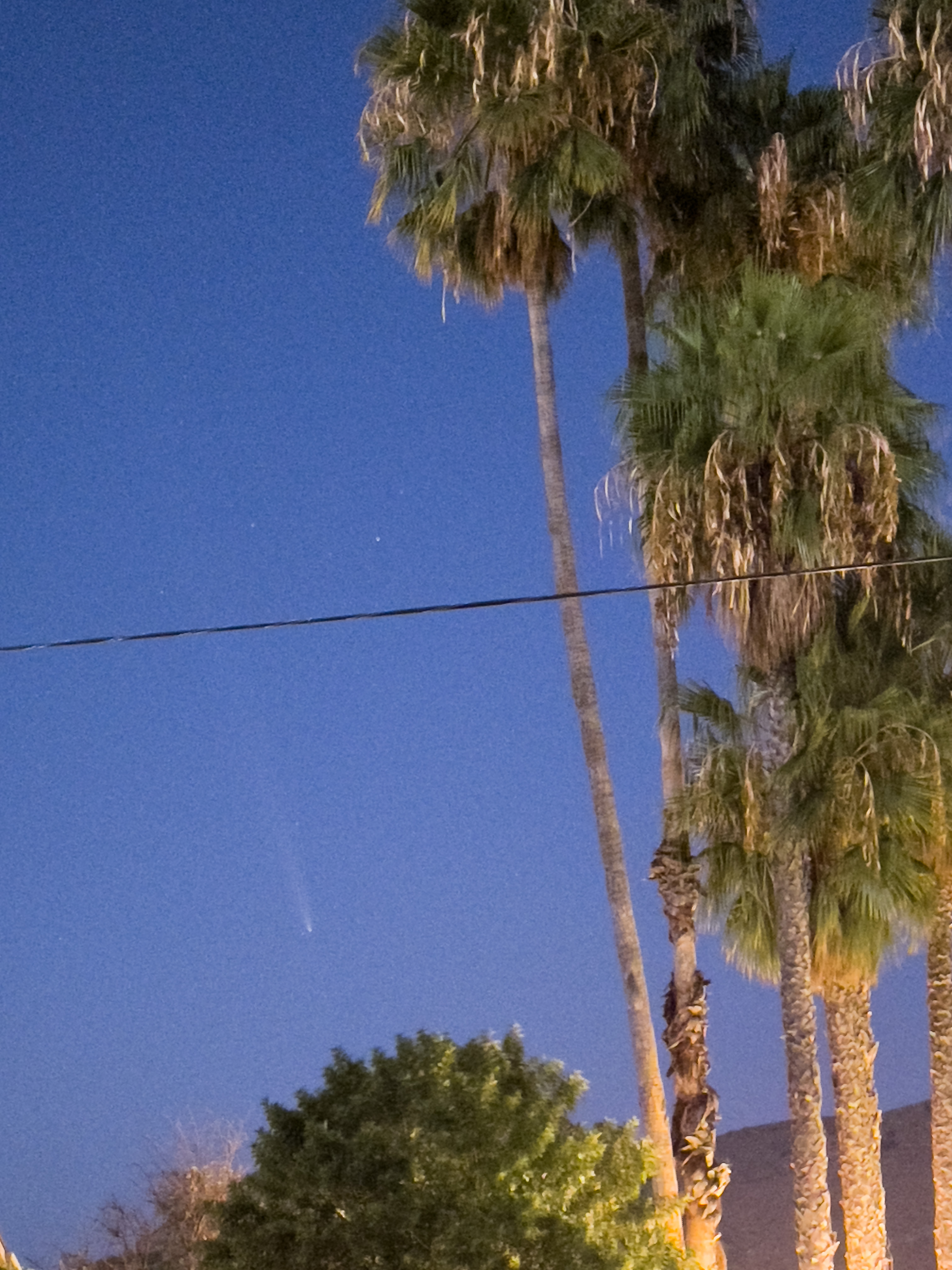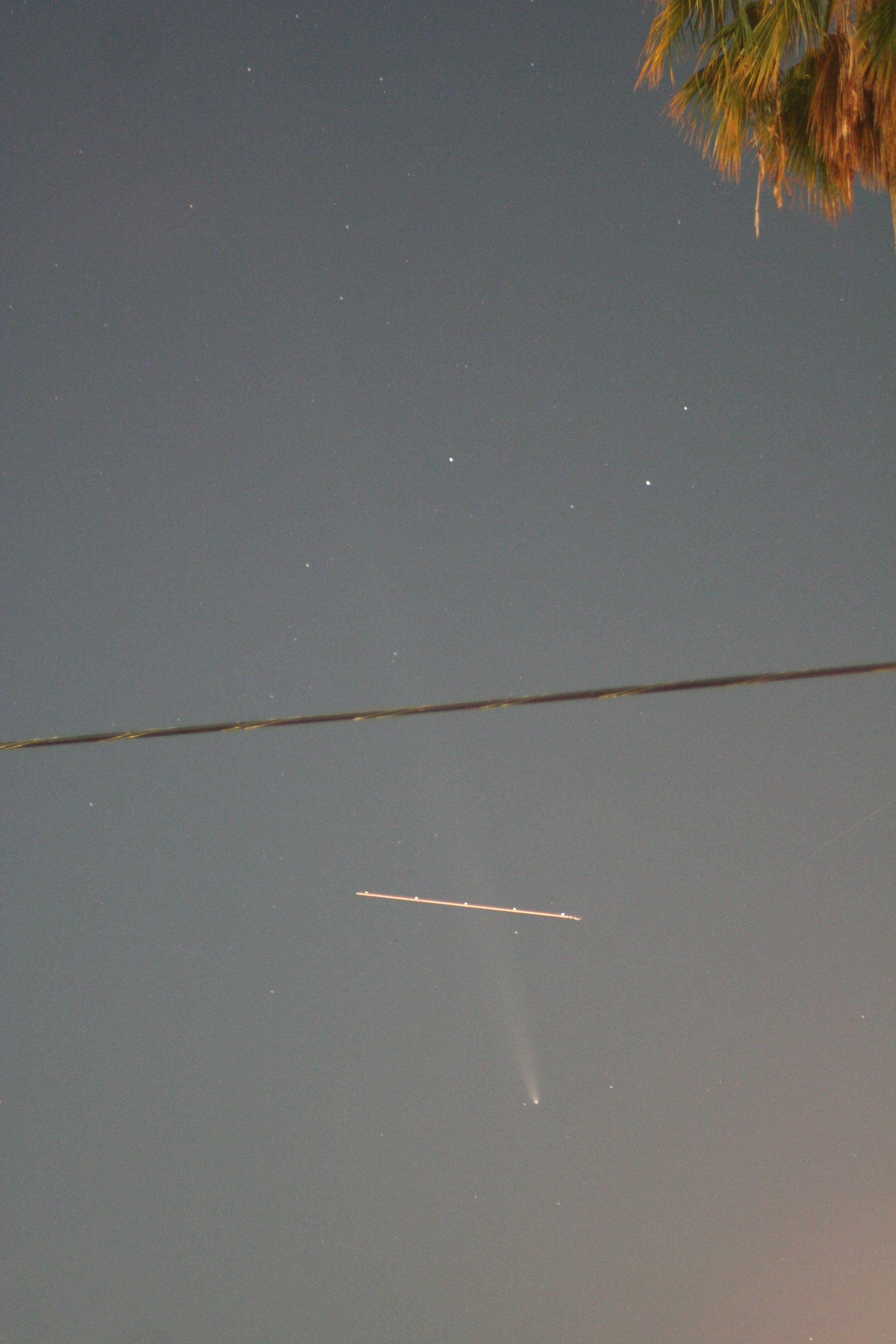 If I went out to a dark sky location the tail would be much more pronounced against a black sky, instead of being washed out by the low-contrast haze and light pollution of the LA metro area. (That red horizontal line is a jet headed toward LAX.)