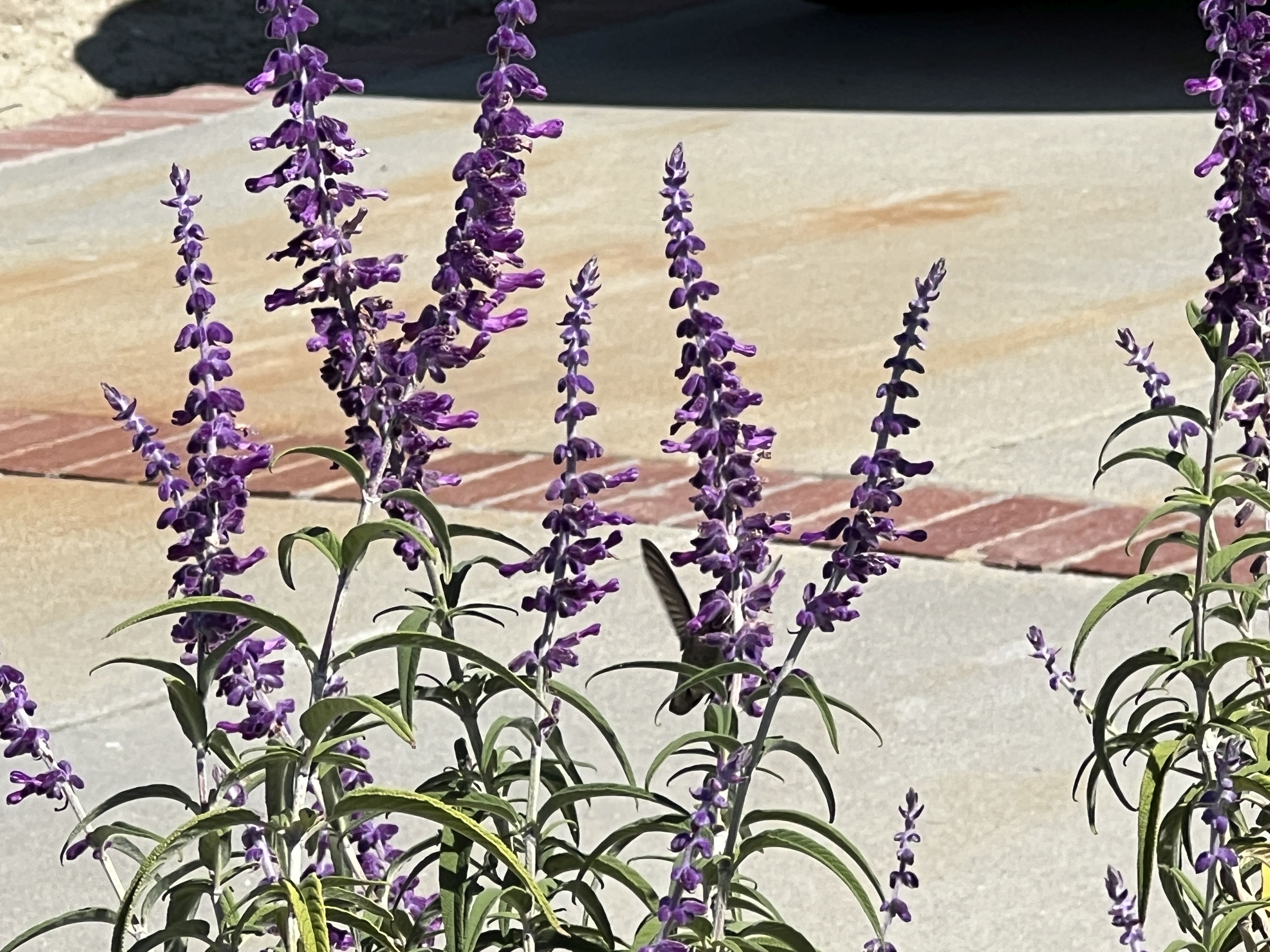 I was getting the mail the other day when I heard a familiar LOUD buzzing sound. Right in front of me, arm’s length away, attacking the purple flowers that surround the mailbox, was a vibrant, green hummingbird.