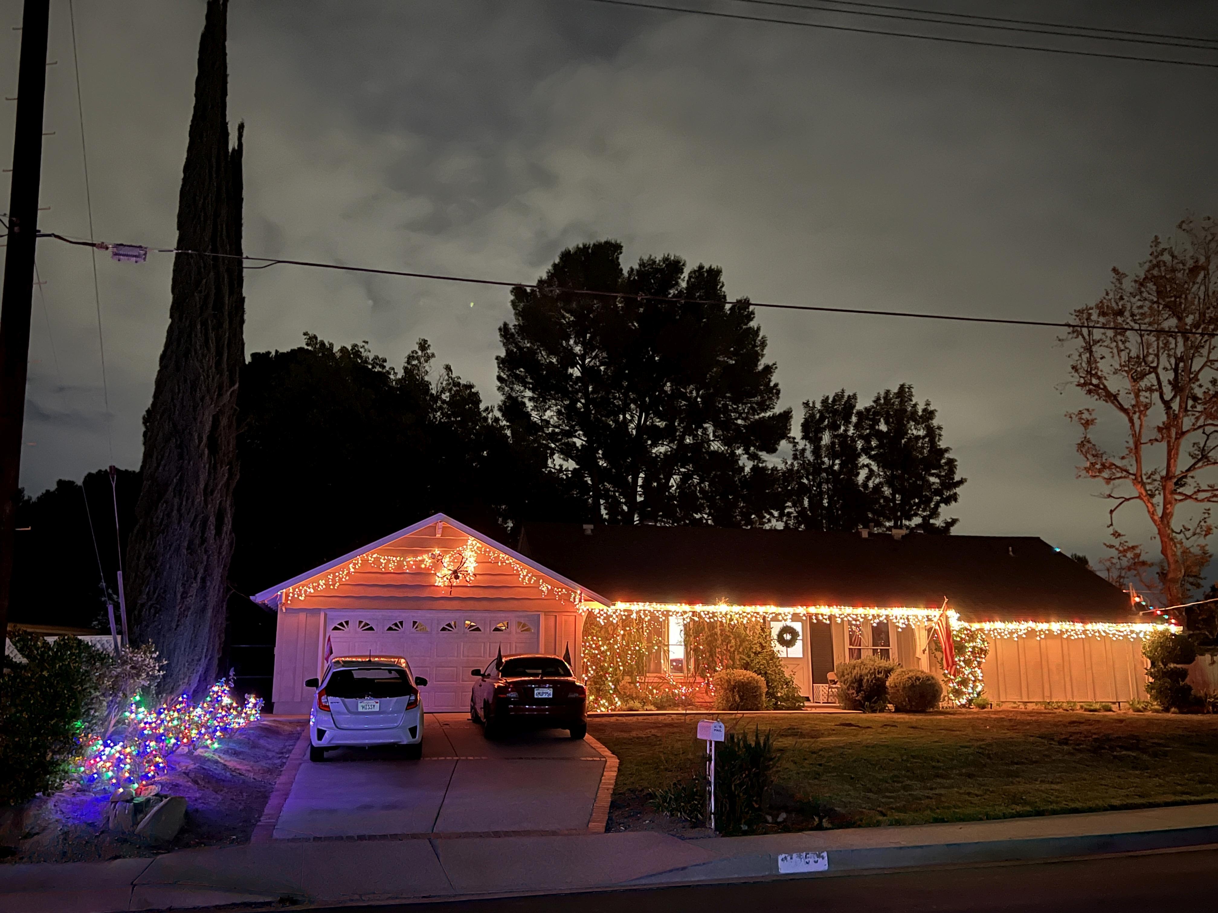 The incandescent lights have a much warmer color to them, but at least now the LEDs are as bright as the incandescents. When the LEDs first came out they were MUCH dimmer and I didn’t get them, but that’s changed a lot. I still use the big incandescent C9 bulbs along the roof line, and I’m finding that getting up on the 20′ extention ladder to get up to the peak of the roof on the end of the house is getting tougher (and more dangerous) every year. So far this year there haven’t been any falls! (Unlike the previous two years, but we don’t speak of those things. No hospital visits necessary, but there have been some “interesting” experiences.)