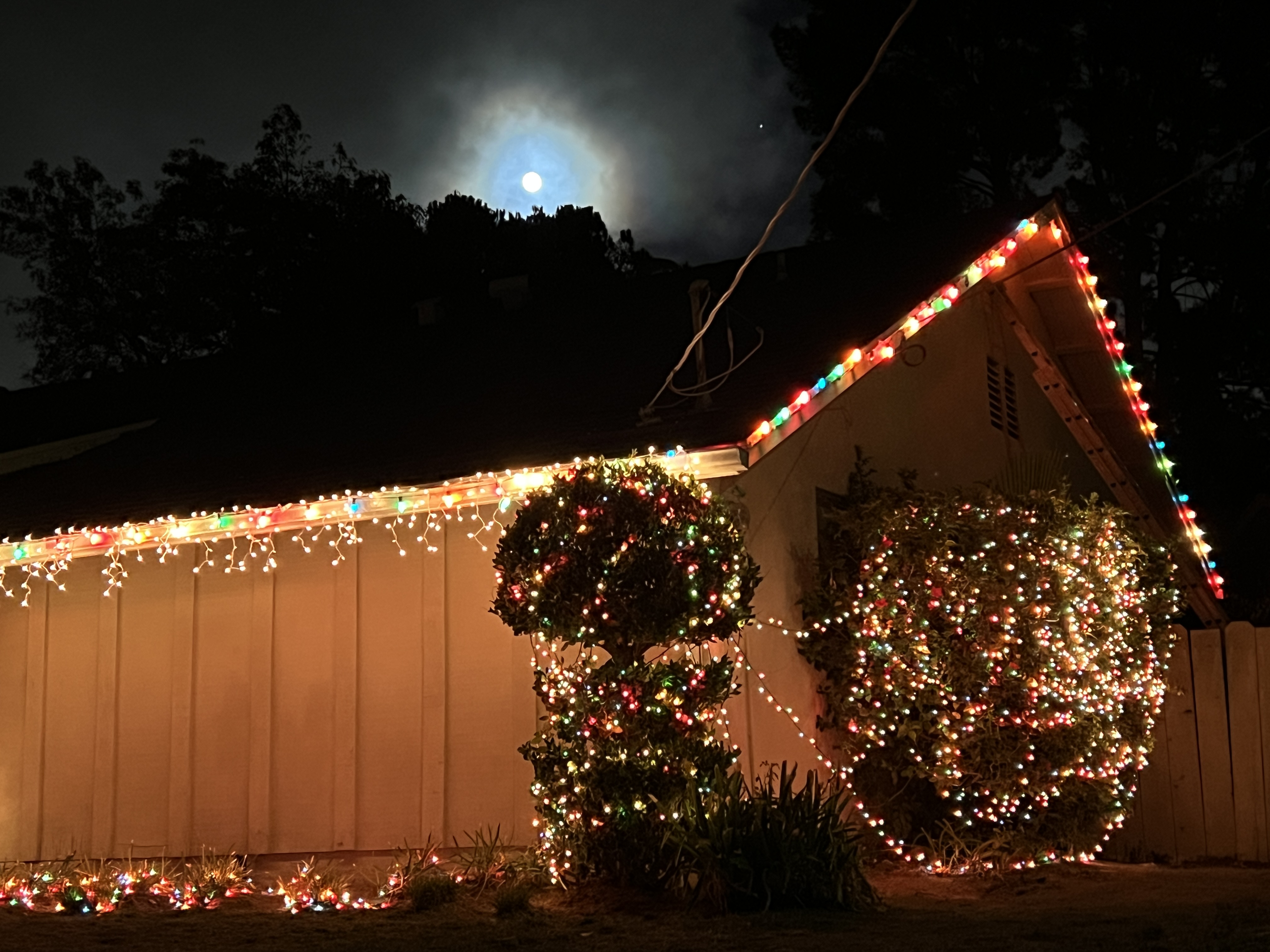 The glow around the Moon is from a layer of clouds, which are just barely thin enough to allow the Moon and Jupiter (off to the right of the Moon, near the tree) to be seen.