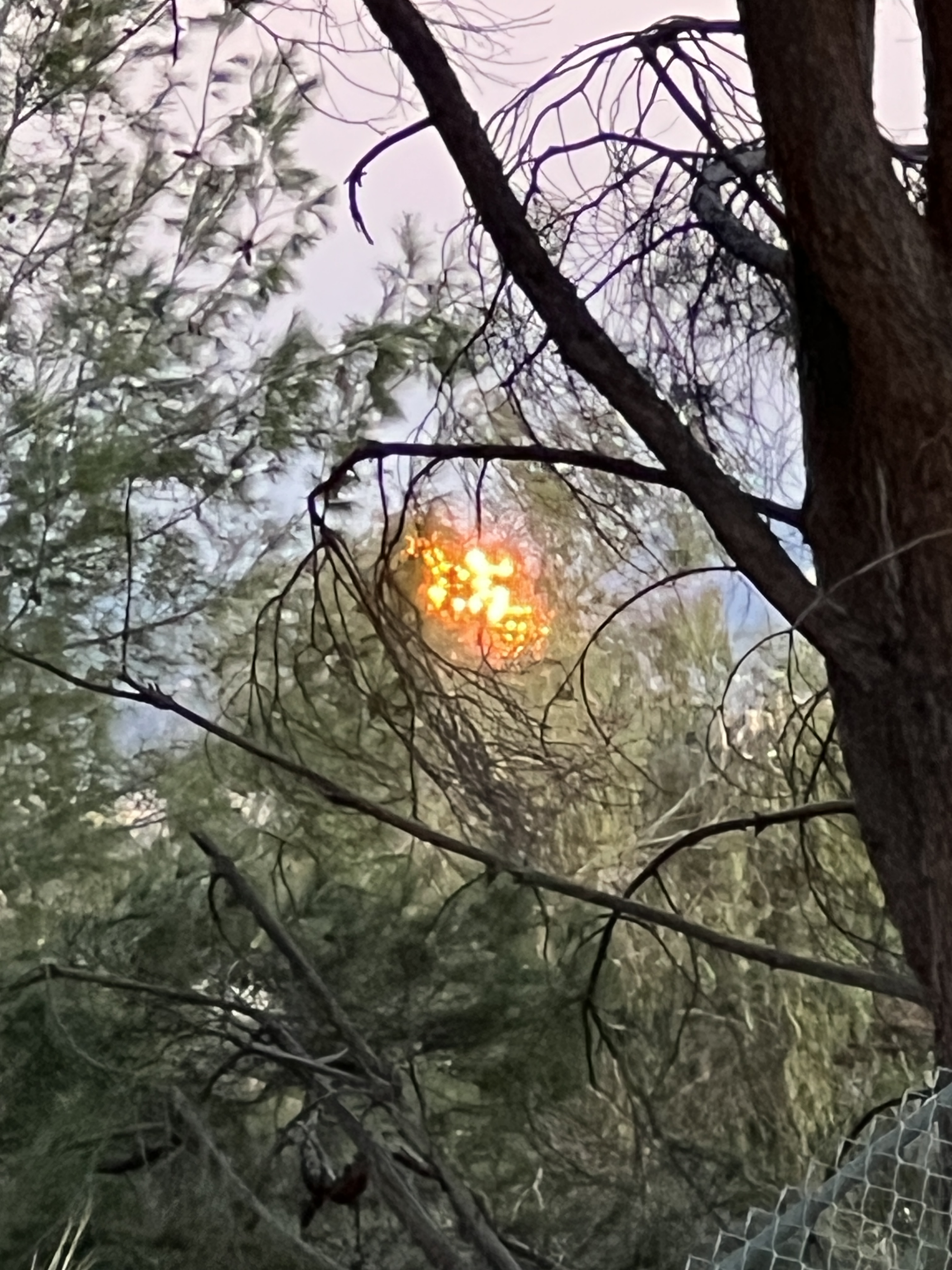 Low, seen through the trees, about five miles away in Warner Center is one of those glass & steel office buildings, 6-8 stories tall. At this moment it made a fantastic mirror. The sunlight was nice and orange, having passed through a whole lot of smoke to get there.