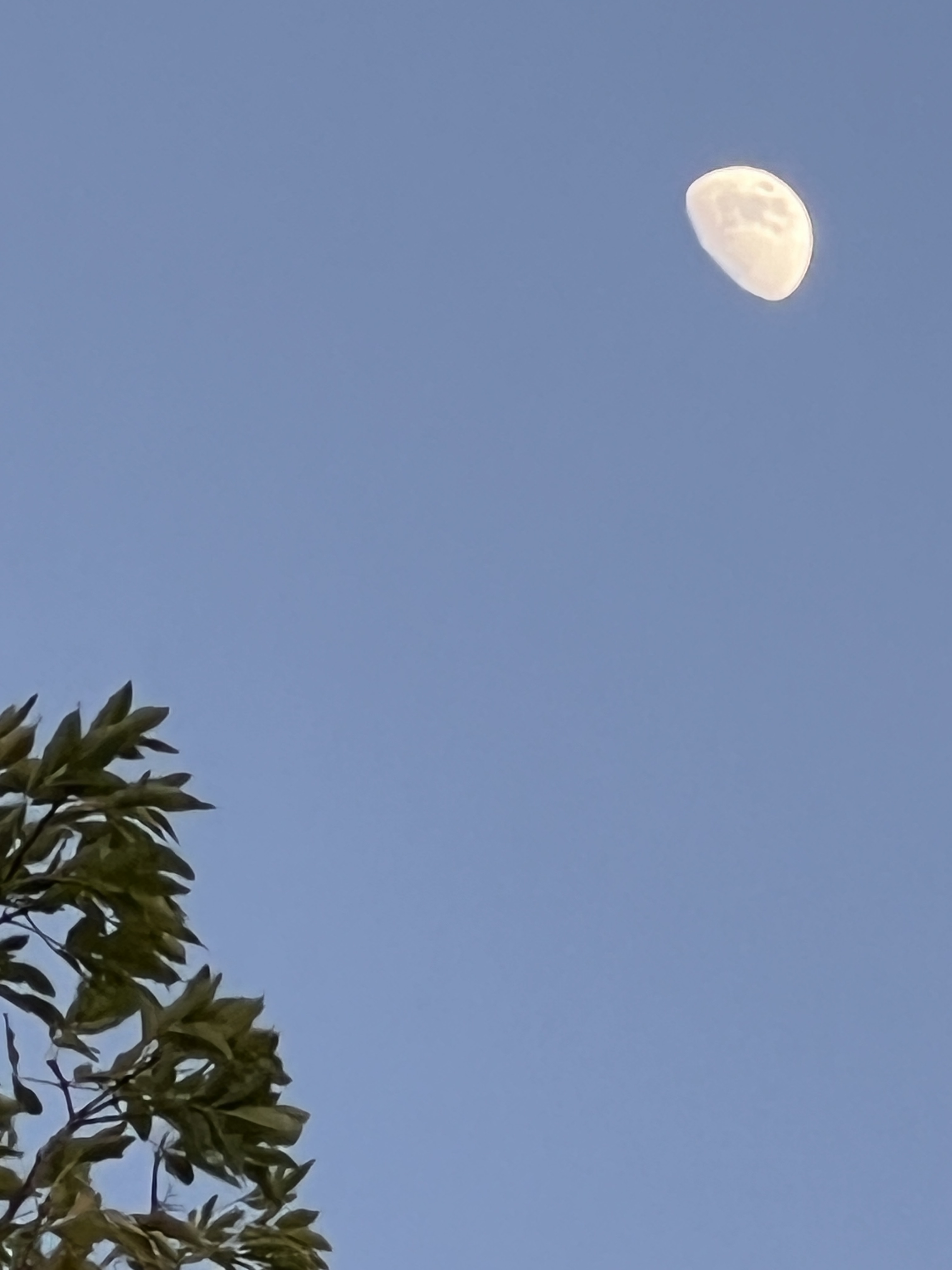 High above the trees, the 3/4 moon, looking more white than orange, about 227,190 miles away.