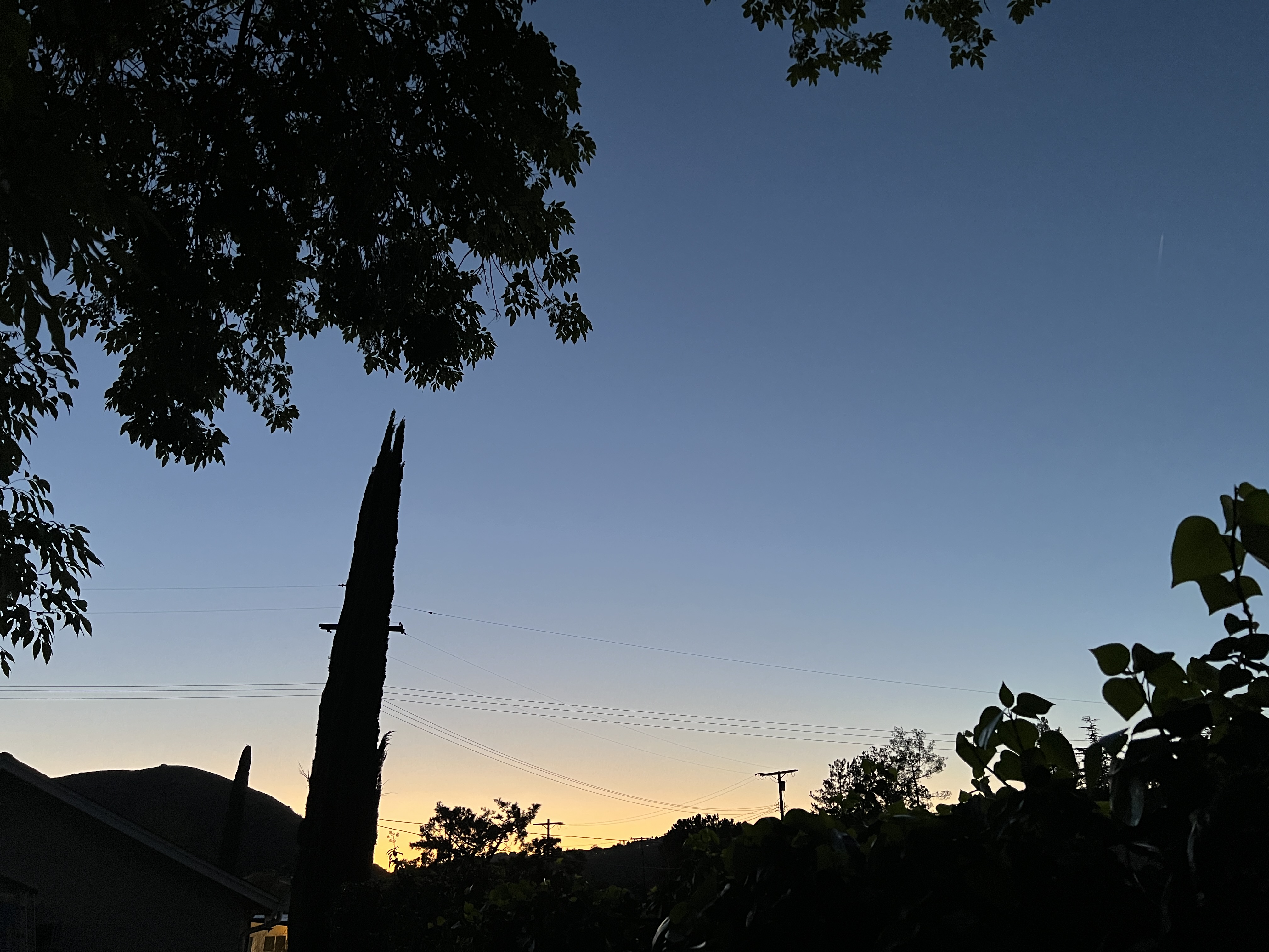 But sunset tonight was lovely, even without a cloud in the sky. That spectacular gradient as white fades to pink fades to orange fades to blue fades to indigo fades to black, with 100,000 separate shades squeezed in between.