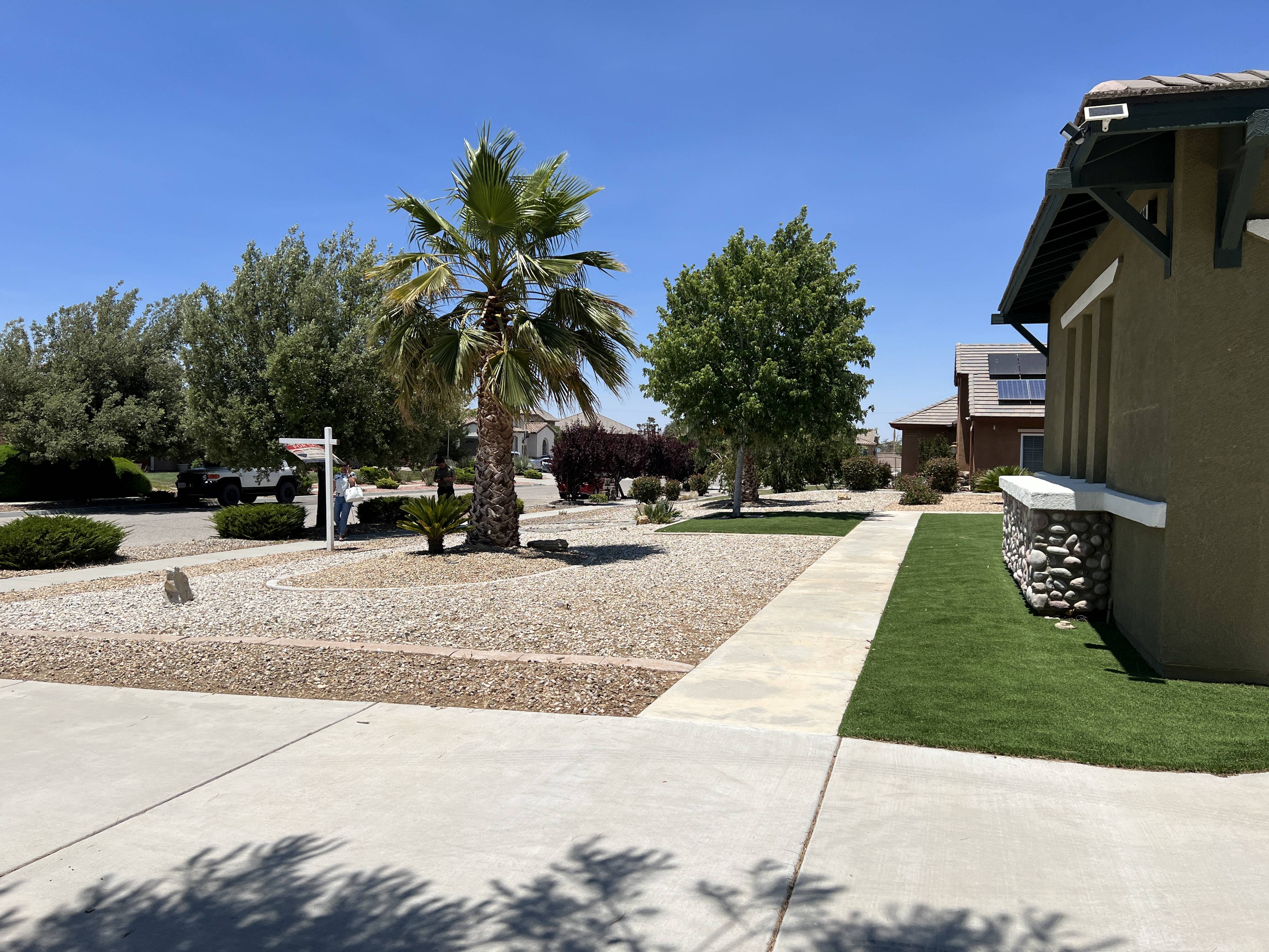 Before we close we’ll have to double check the area between the palm tree there and the driveway – one of the issues we’ve been dealing with is the state of the septic tank and I think that’s where they’ve had to dig to inspect it. And no, that’s not grass next to the house and over by the front door, it’s turf. As hot and dry as it gets out here, keeping any amount of grass that green requires more (expensive) water than a small, third-world country uses. Only the golf courses and country clubs can afford that.