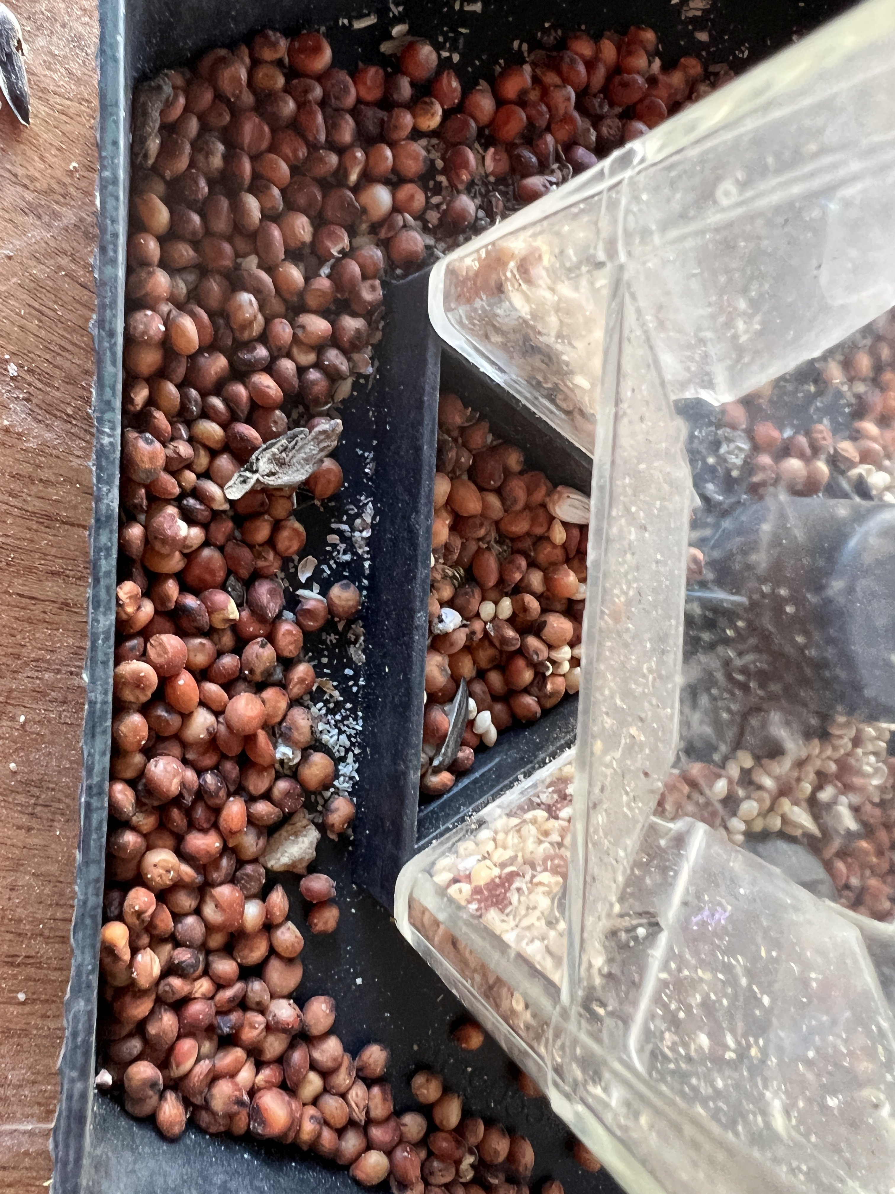 One thing I’ve noticed in refilling the birdseed feeders is that the bottom is always full of these little, round, red seeds: