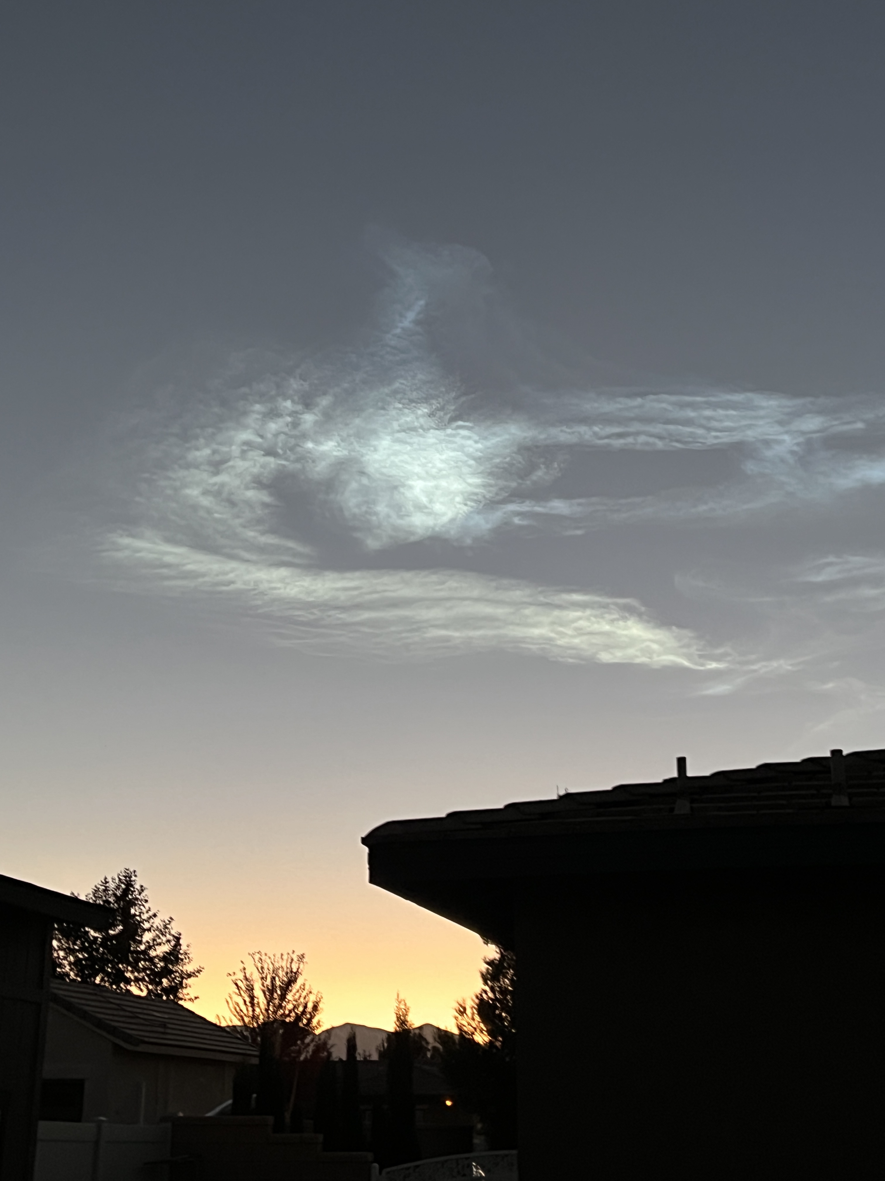 They look like noctilucent clouds, but those would be incredibly rare this far south. Normally you would only see them way north, in the polar regions.