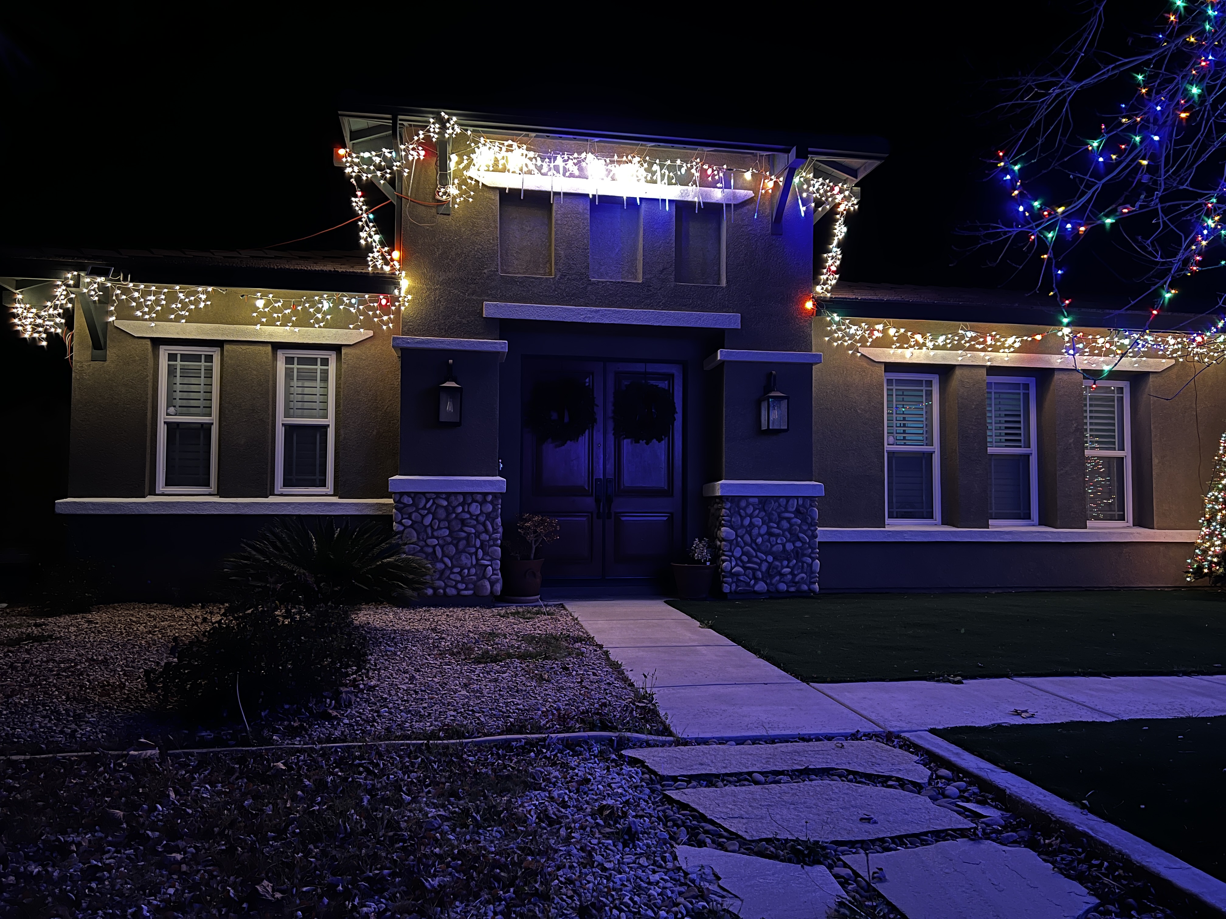 When last we saw our plucky hero, the new Forever Home had a substantially larger roofline than the old houses, so while the “baseline” colored C9 lights and white icicle lights had been put up, there were large gaps in the front that didn’t have lights at all. By the time this was discovered, buying additional lights in the store was out of the question and it took a couple weeks for them to be found and shipped in an online purchase. Now they’re here, and it was time to get those “baseline” light sets up.