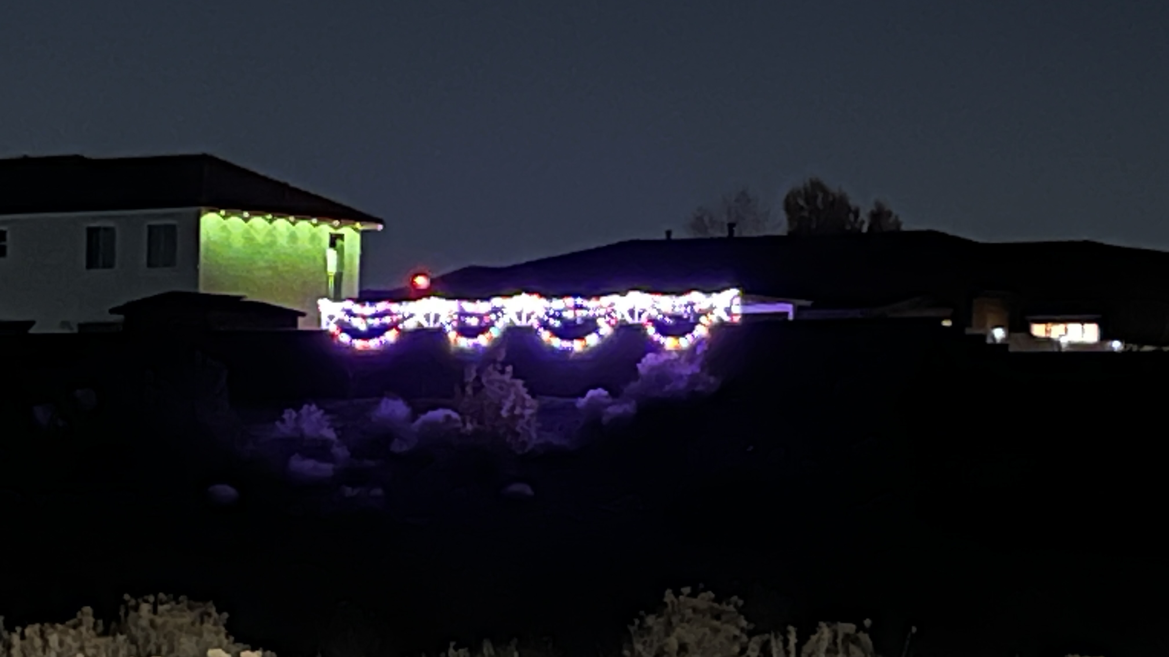 As I mentioned earlier this weekend, because of that, there’s nothing but dirt and weeds on the other side of our back wall, so I started hanging extra Christmas lights on the other side of the back wall. Theoretically I guess that would be in someone else’s yard if they ever built a house on that lot, but they haven’t, so I put lights up that can be seen when you come off of the main street into the back way into the subdivision.