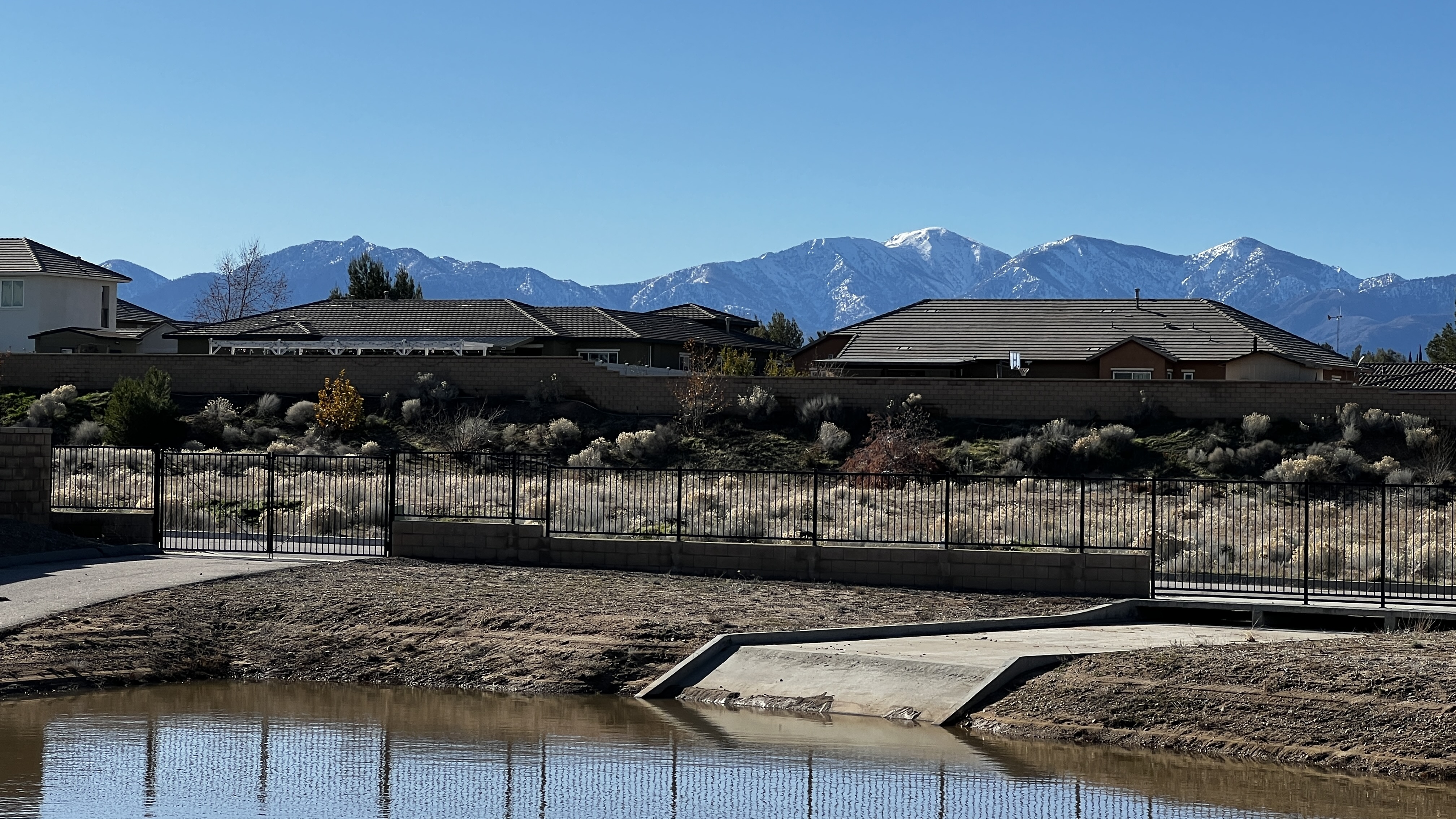 Later, from a lower point of view, i.e., atop the fence surrounding the flood control basin near where I took last night’s pictures of the Christmas lights hanging over the back yard wall, you can see the mountain rising about twenty miles to the southwest of the Forever Home.