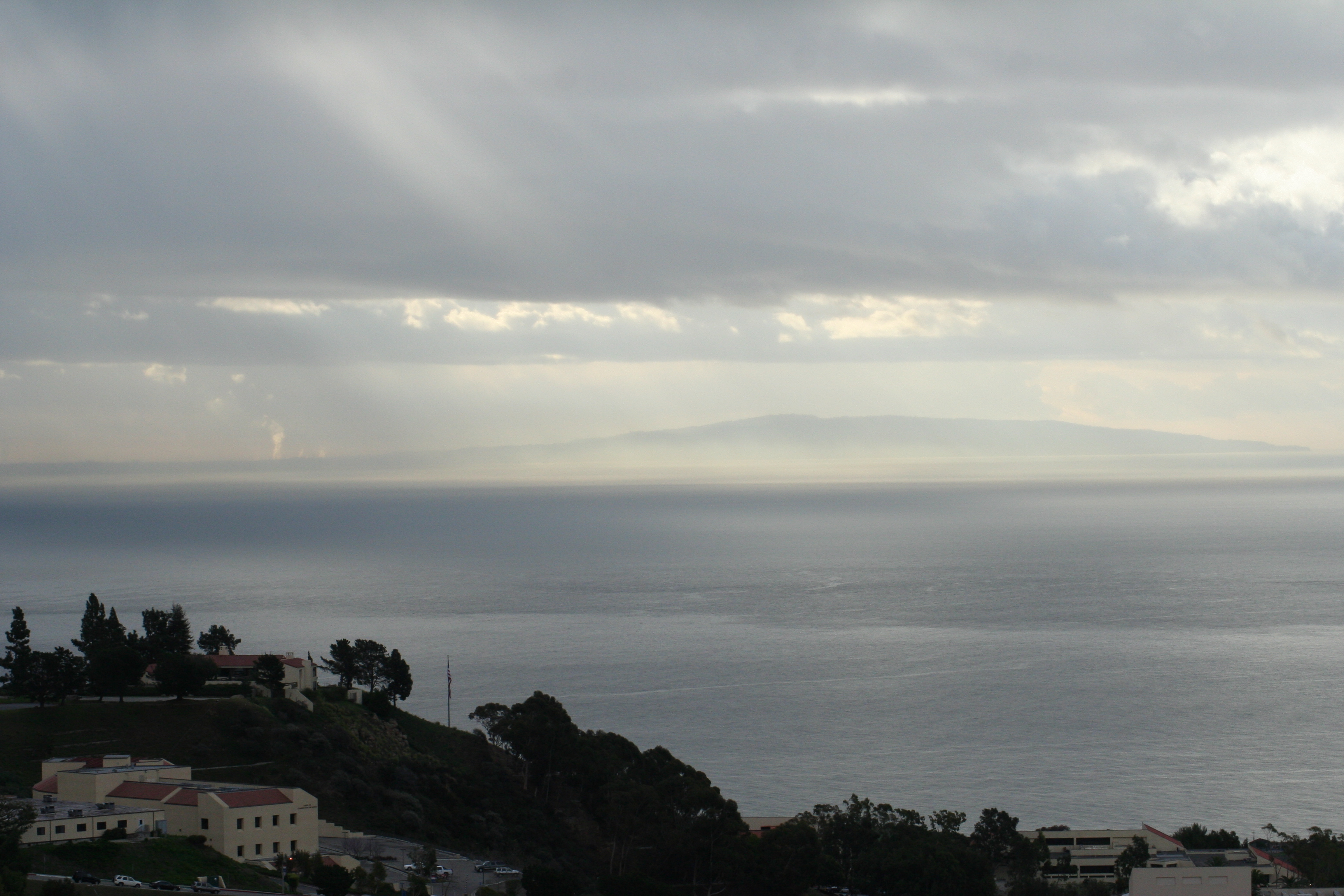 I was in the Executive MBA program, so we had a full three-day weekend of classes about every three weeks, rotating between the Irvine campus, the West LA campus, and the main Malibu campus. This was a rainy weekend at the Malibu campus, with the Rancho Palos Verdes peninsula across Santa Monica Bay to the south.