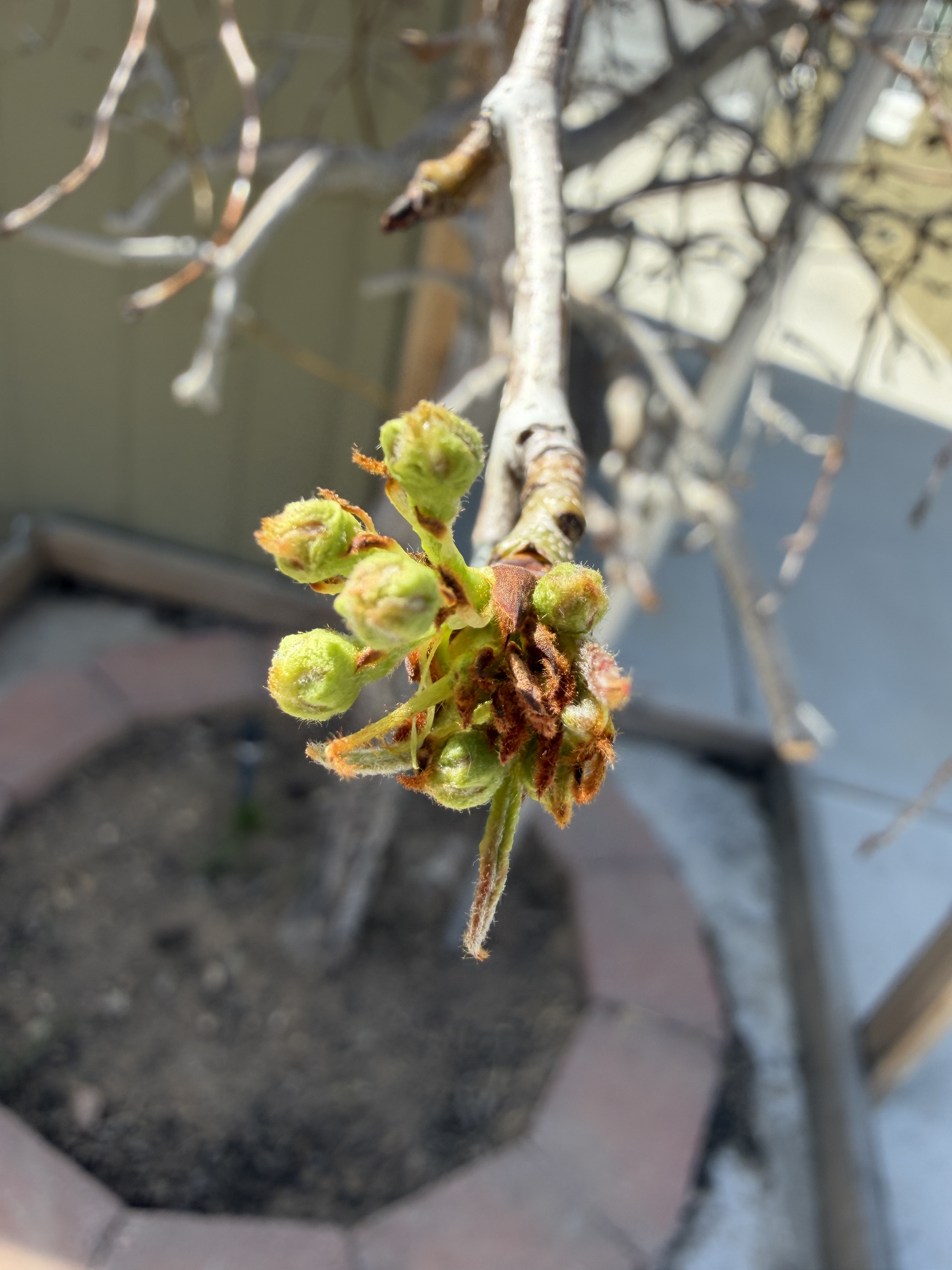 Just before we left for Arizona last Wednesday, five days ago, I went out back to fill the bird feeders and I took a peek at the fruit trees. The apple tree looked like it wanted to be budding and leafing, but didn’t have anything green or flowery popping out yet. But the pear tree…