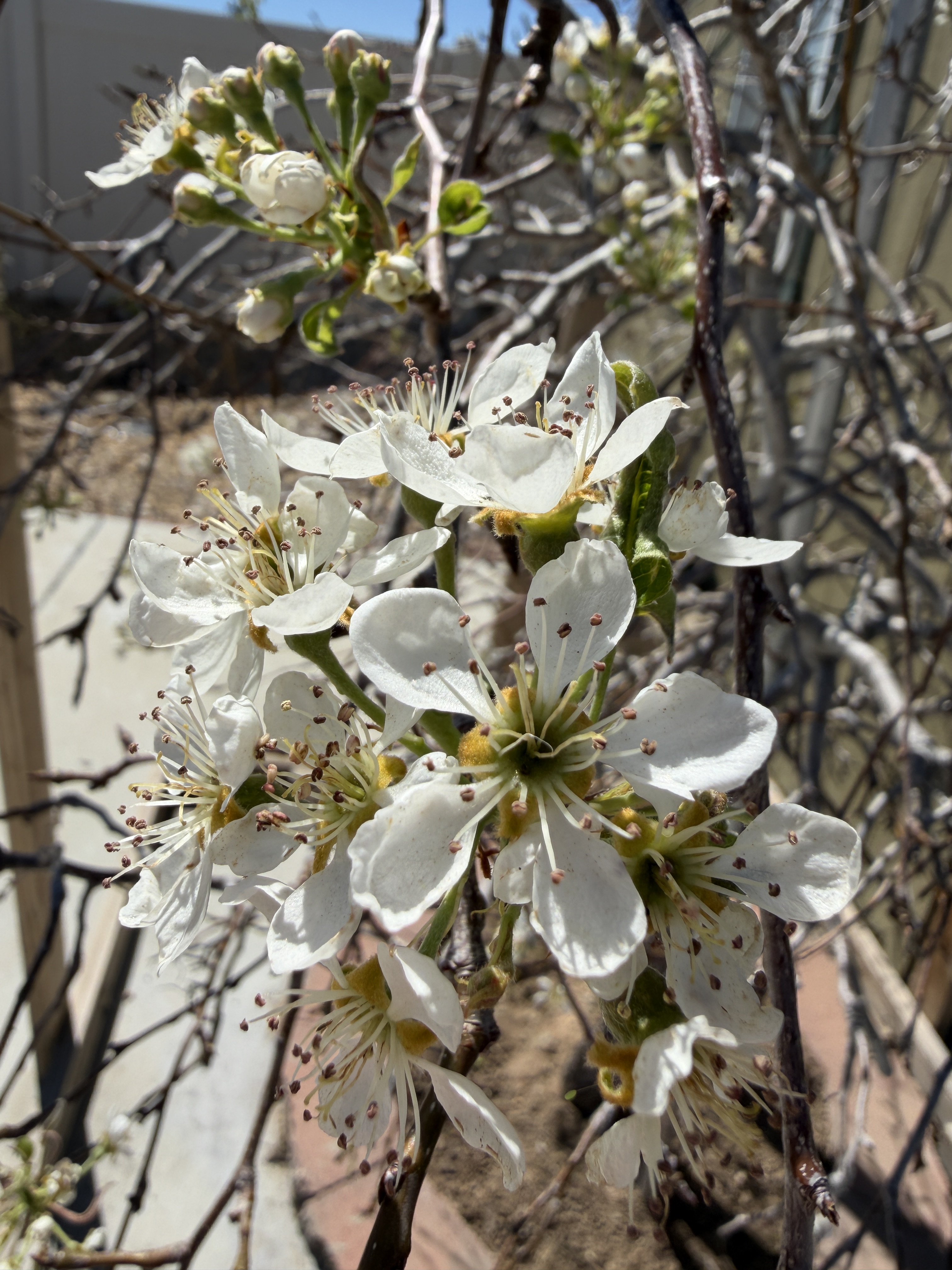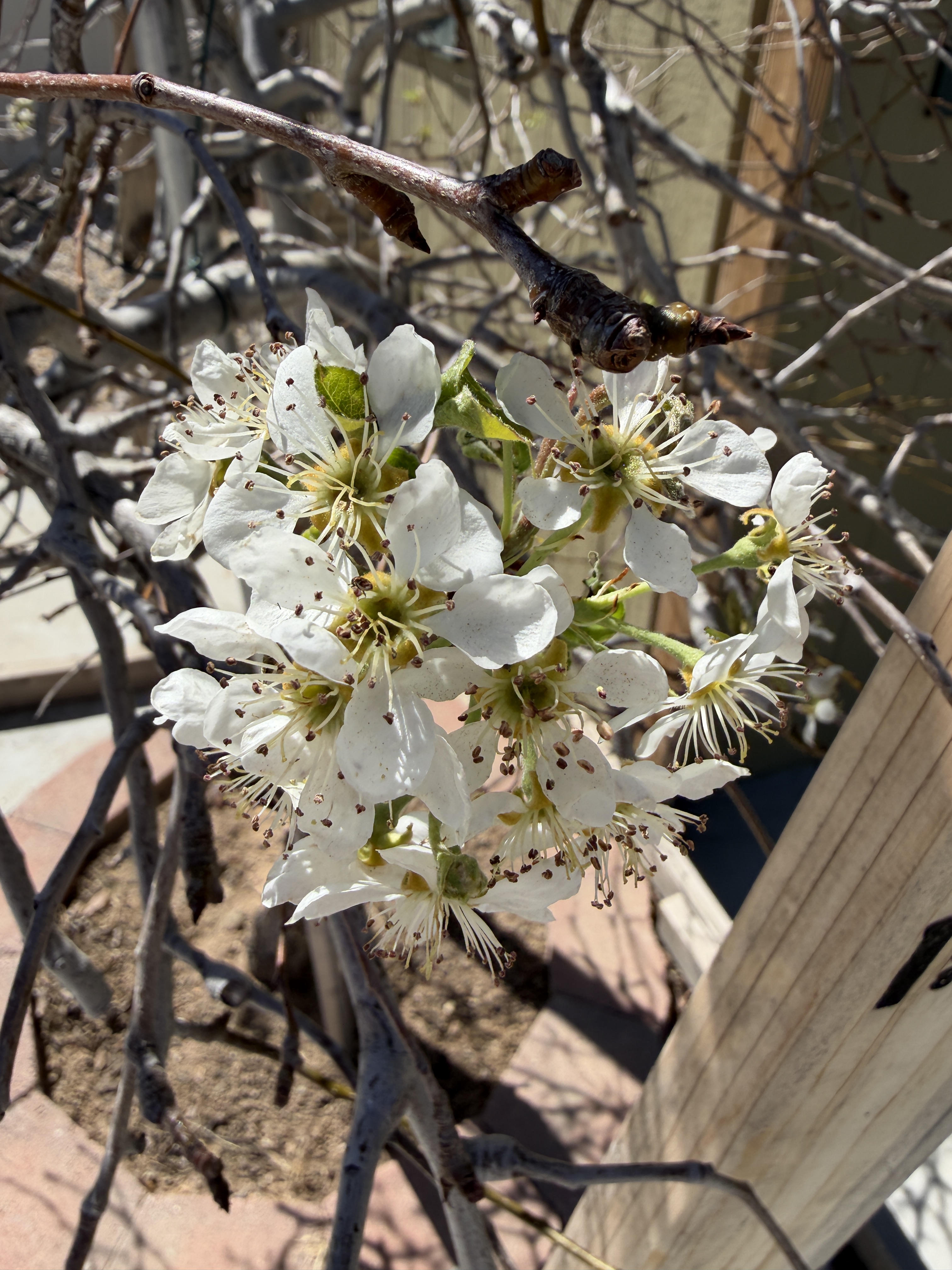 Yesterday I had pre-vacation pictures of the first flower buds starting to pop out on the pear tree. Today I went out to see how things progressed while we were gone.