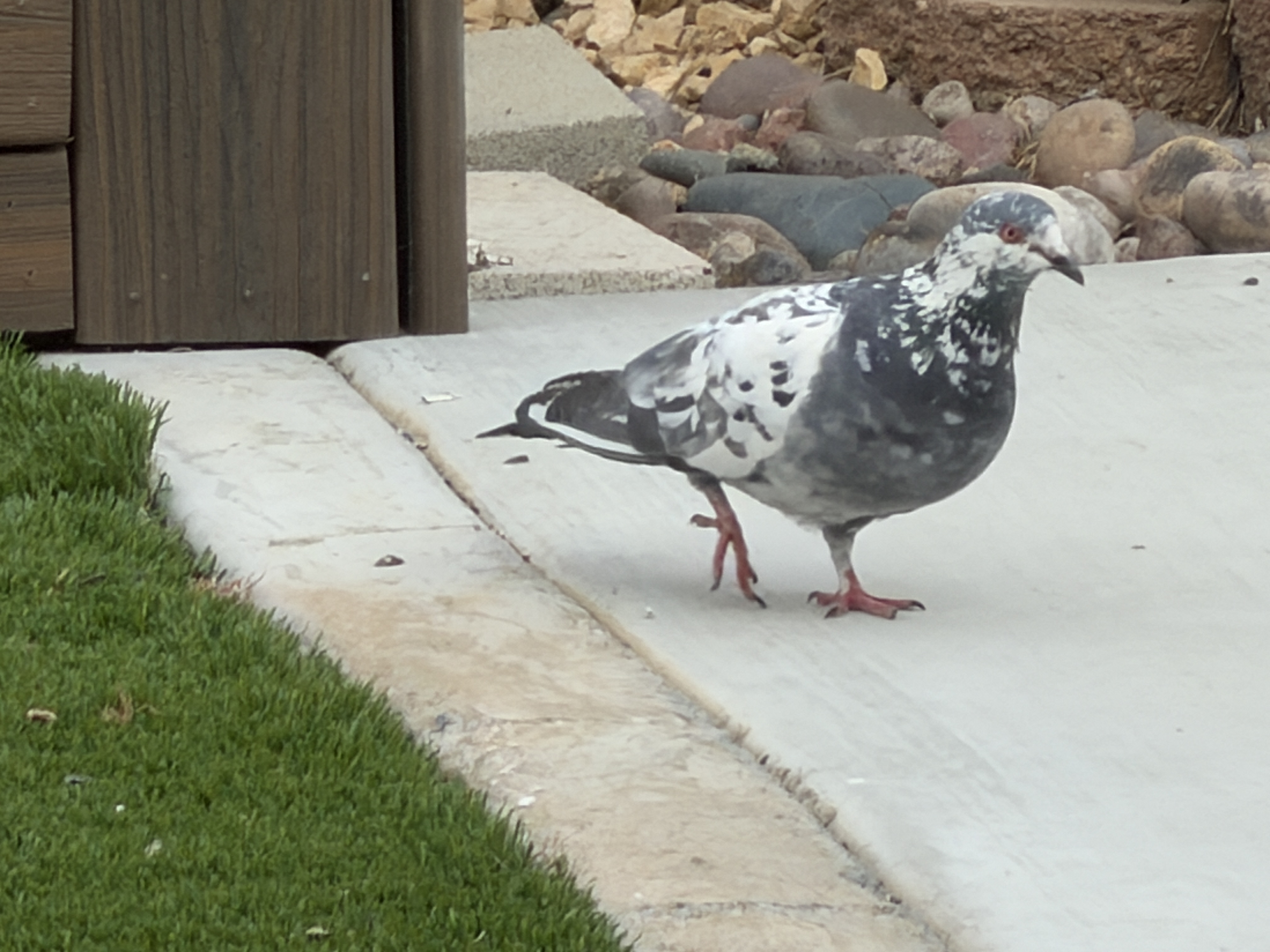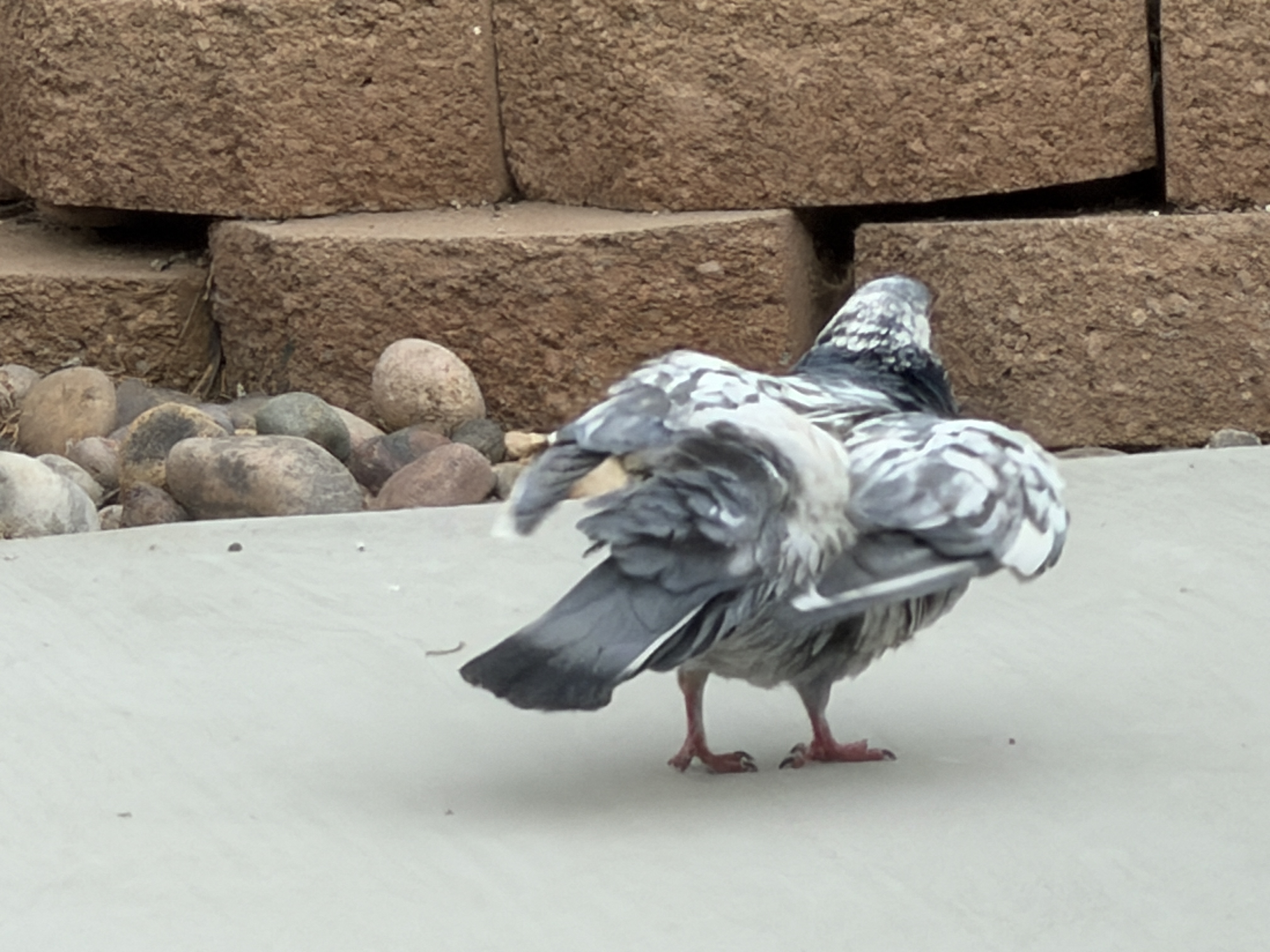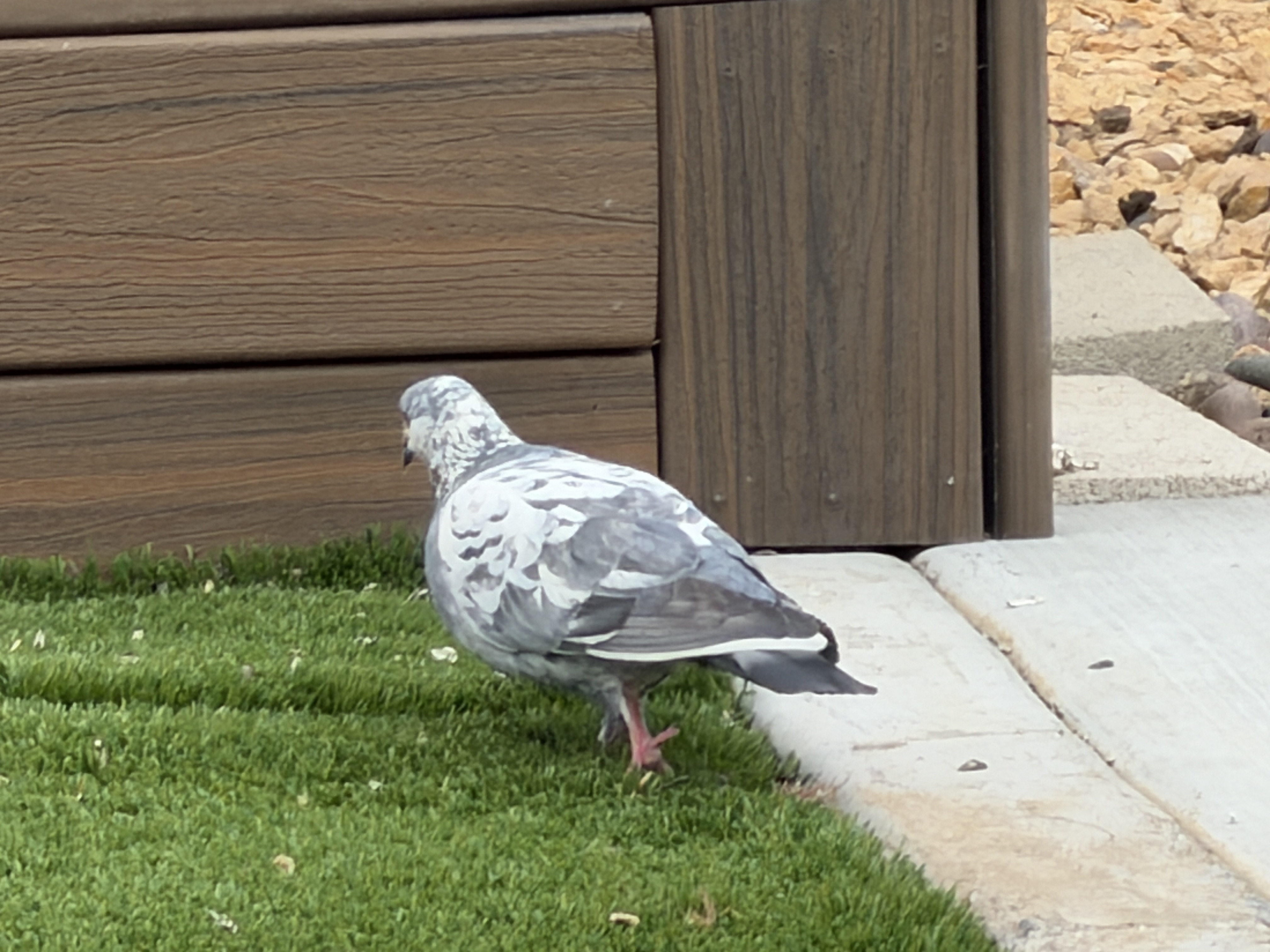 Then, just after we got back from our Arizona trip, I started being woken up in the morning by the cooing of pigeons and scratching of their claws on the metal flashing of the chimney for the fireplace in our bedroom. If they’re sitting up there, the sound gets carried down the chimney and amplified. Then I started seeing them down on the ground underneath the bird seed feeders, up to four or five at a time, picking through the seed dropped by the finches and wrens at the feeders. The pigeons and squirrels seem to hang out together nicely when they’re scrounging through the astroturf for fallen seeds.