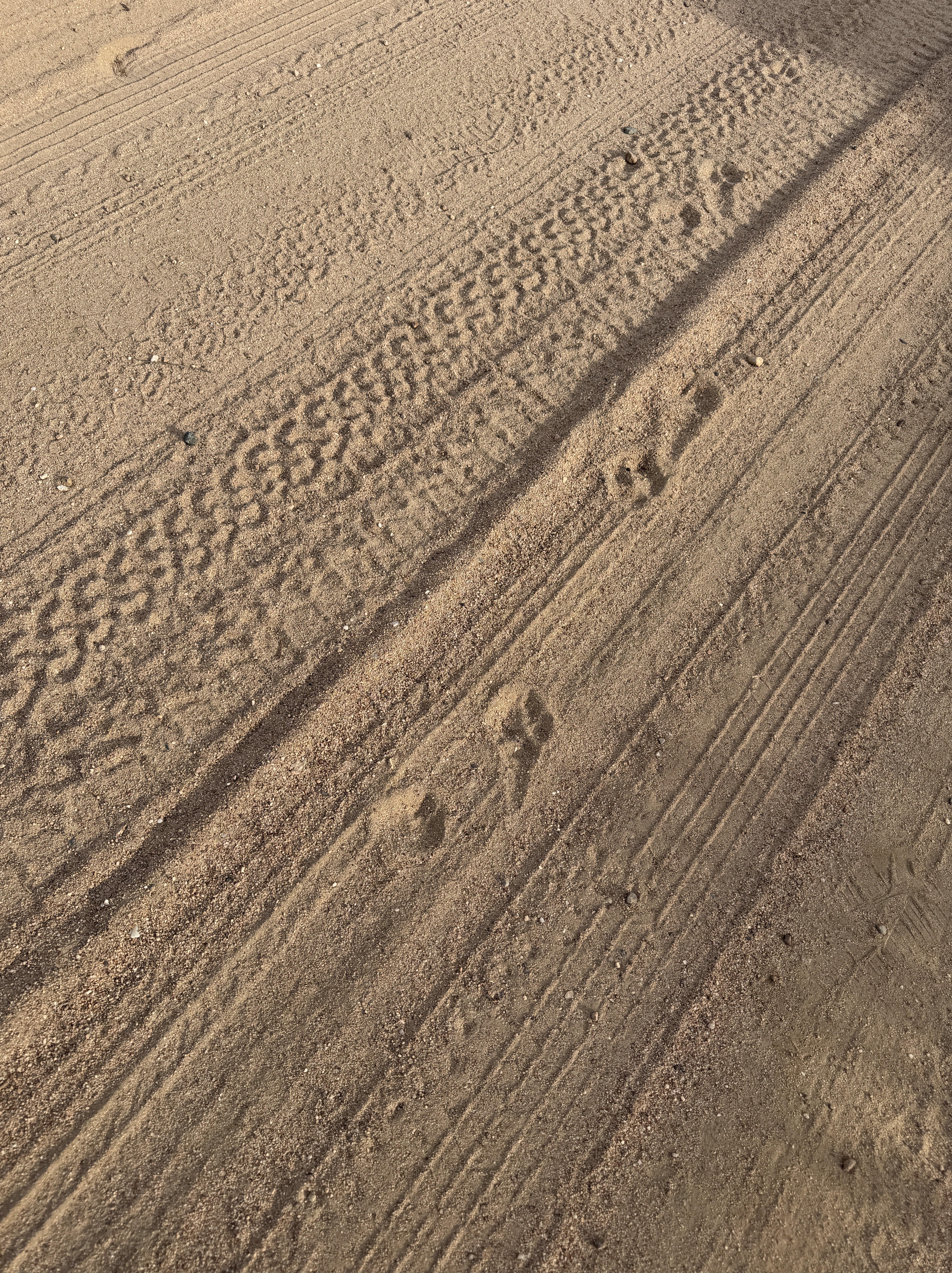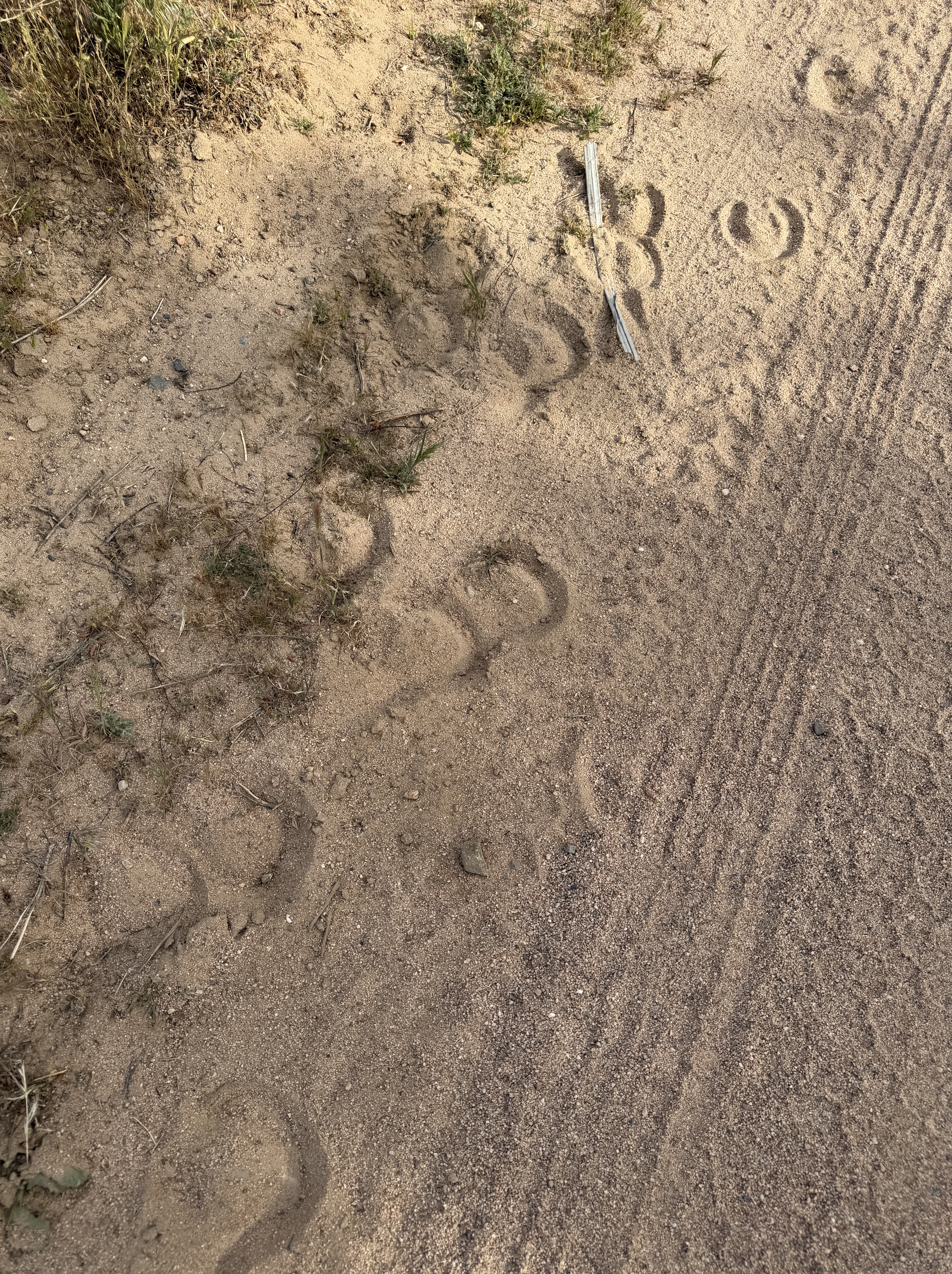 My Boy Scout days are way, WAAAAAY behind me, so I can’t positively identify these tracks. But the smart betting money is on “dog,” although other critters such as deer or coyotes can’t be ruled out. But just as lots of folks ride their horses out on these dirt service roads, so do lots of folks go hiking and walking their dogs. Usually on a lead I would think, not running loose, since I would worry about rattlesnakes and other less-than-friendly critters off in the brush and tumbleweeds.