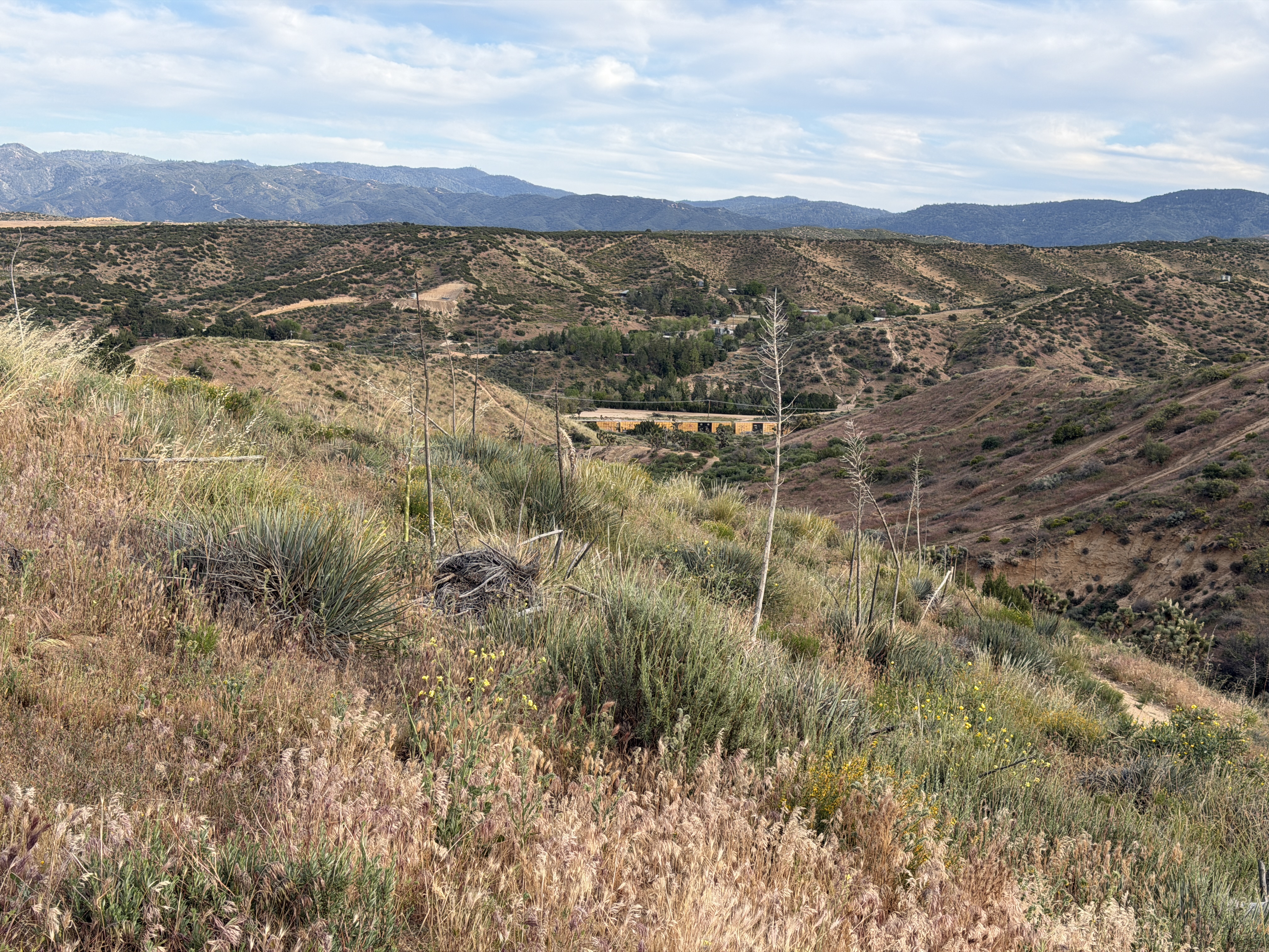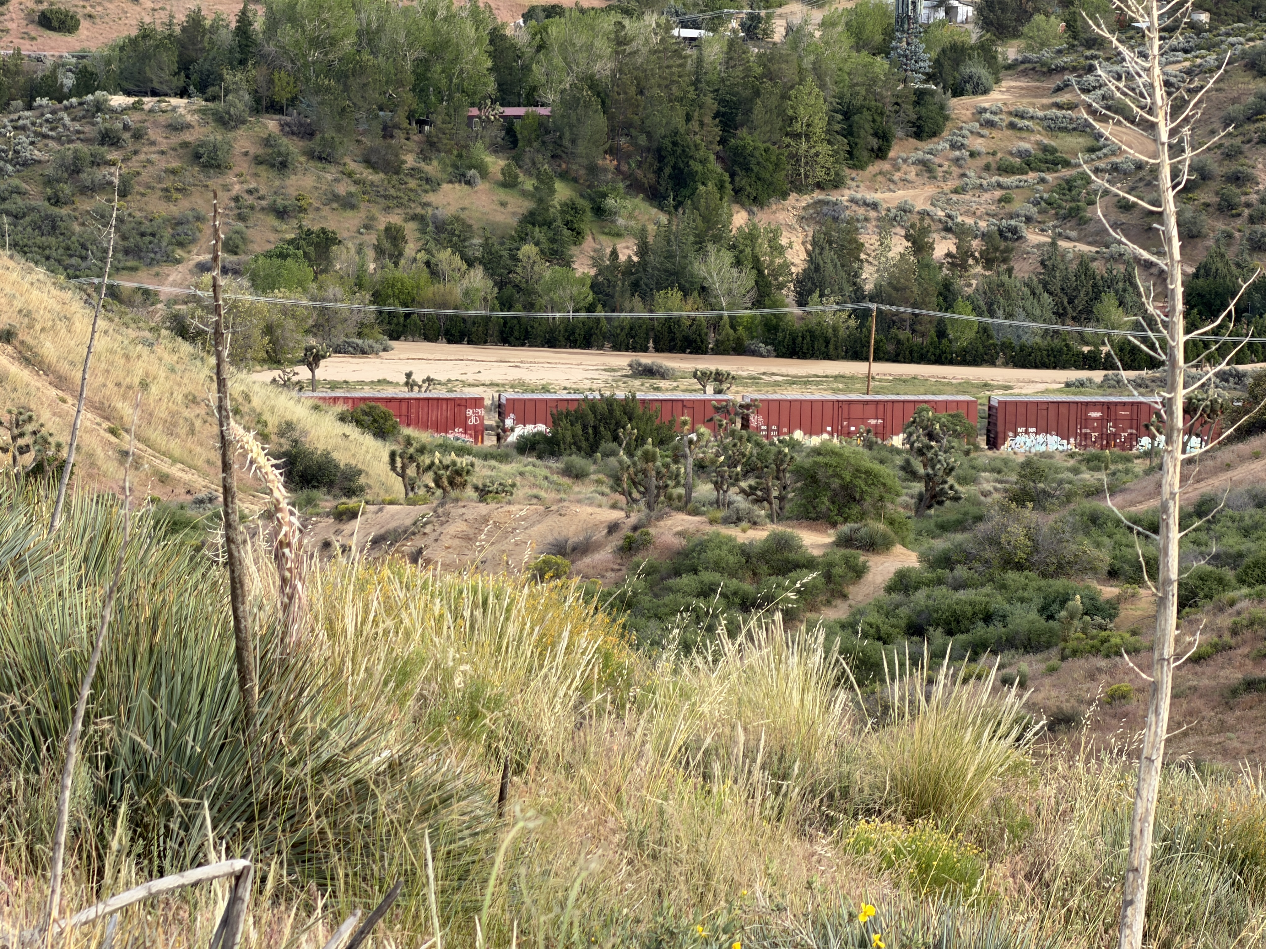 Following the dirt road a quarter mile after the pavement ends (a mile or two from our house) looking for the edge of “the Mesa” (where the valley floor drops away into the canyons of the Cajon Pass) I was primarily looking for the BNSF train tracks that I know are there. It’s the two lines of the BNSF main transcontinental line, and I’ve been watching it for several years ons some of the railfan webcams. There used to be a Virtual Railfan camera that I watched all the time, but apparently that house next to the tracks got sold and the new owner didn’t want to maintain the camera and let it die. (Interestingly, I actually looked at that house on Zillow without realizing that it was THE house where the VR webcam was. I knew that it was near that site, and the house ticked off several green flags and boxes to match what we were looking for, but it sold before we could come up and look at it. What could have been…) Anyway, there’s now a very good camera there from RRPhotographer. The location near my house where I could get to the edge is about four miles from the RRPhotographer camera location, but only about a third of a mile from the tracks climbing up the hill. I was hoping to see them and find a good viewing spot.