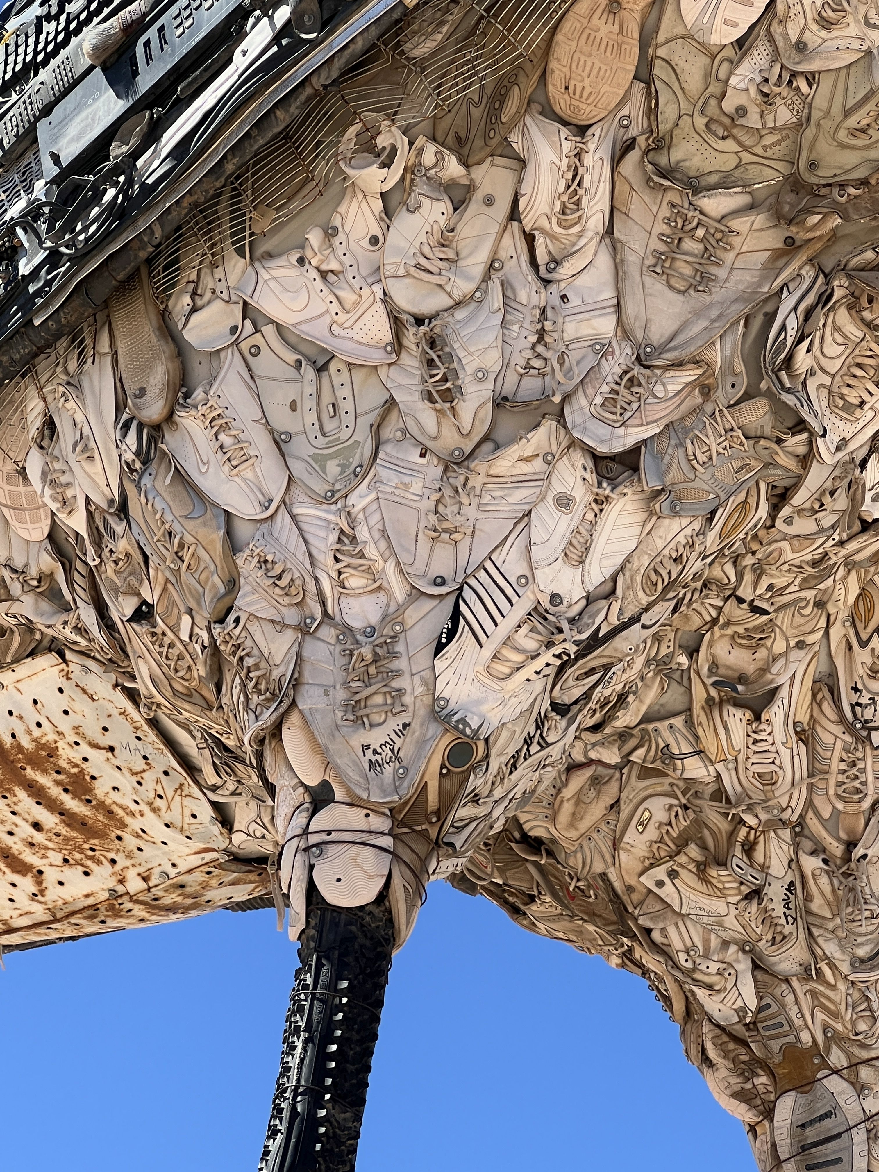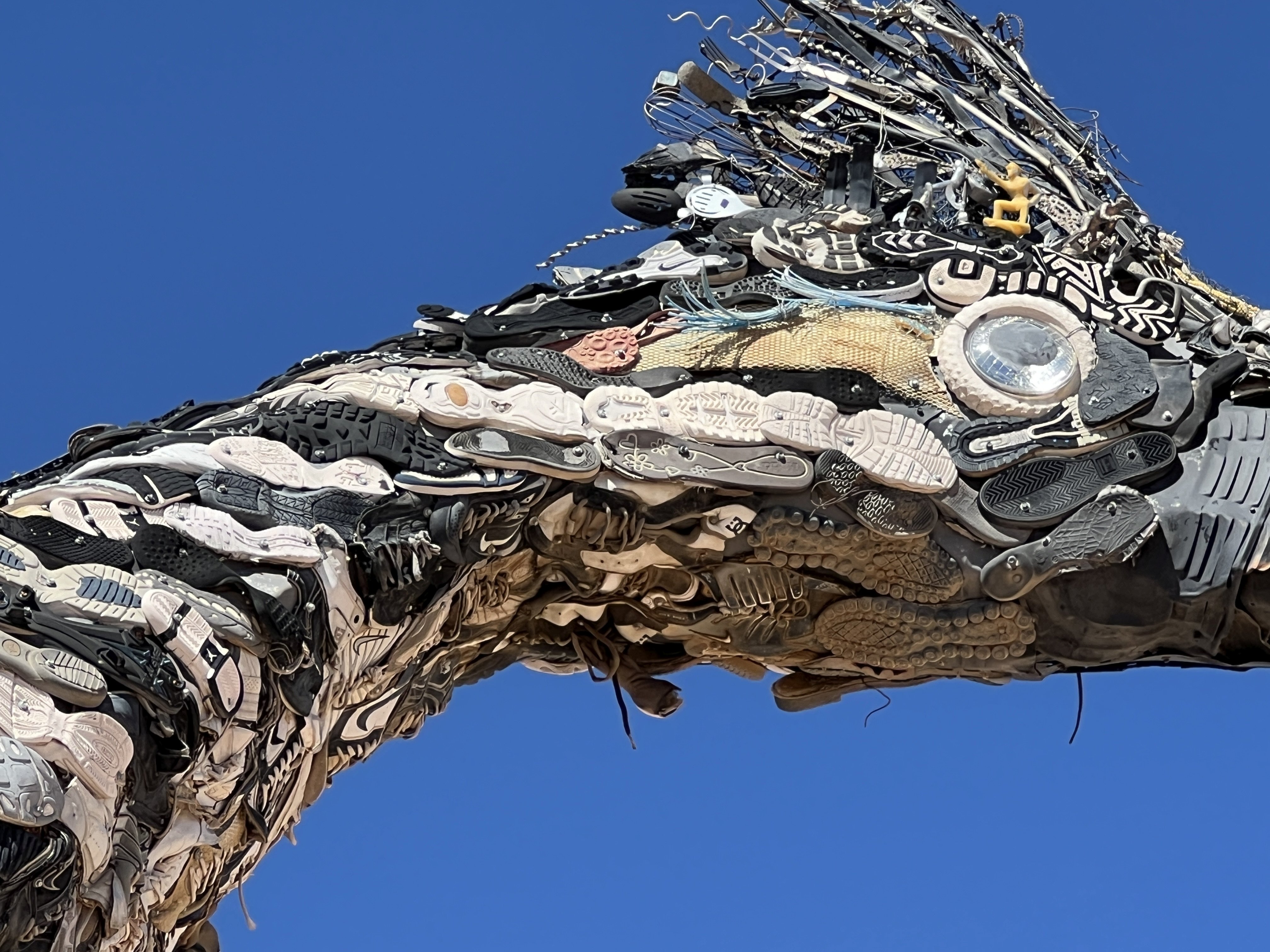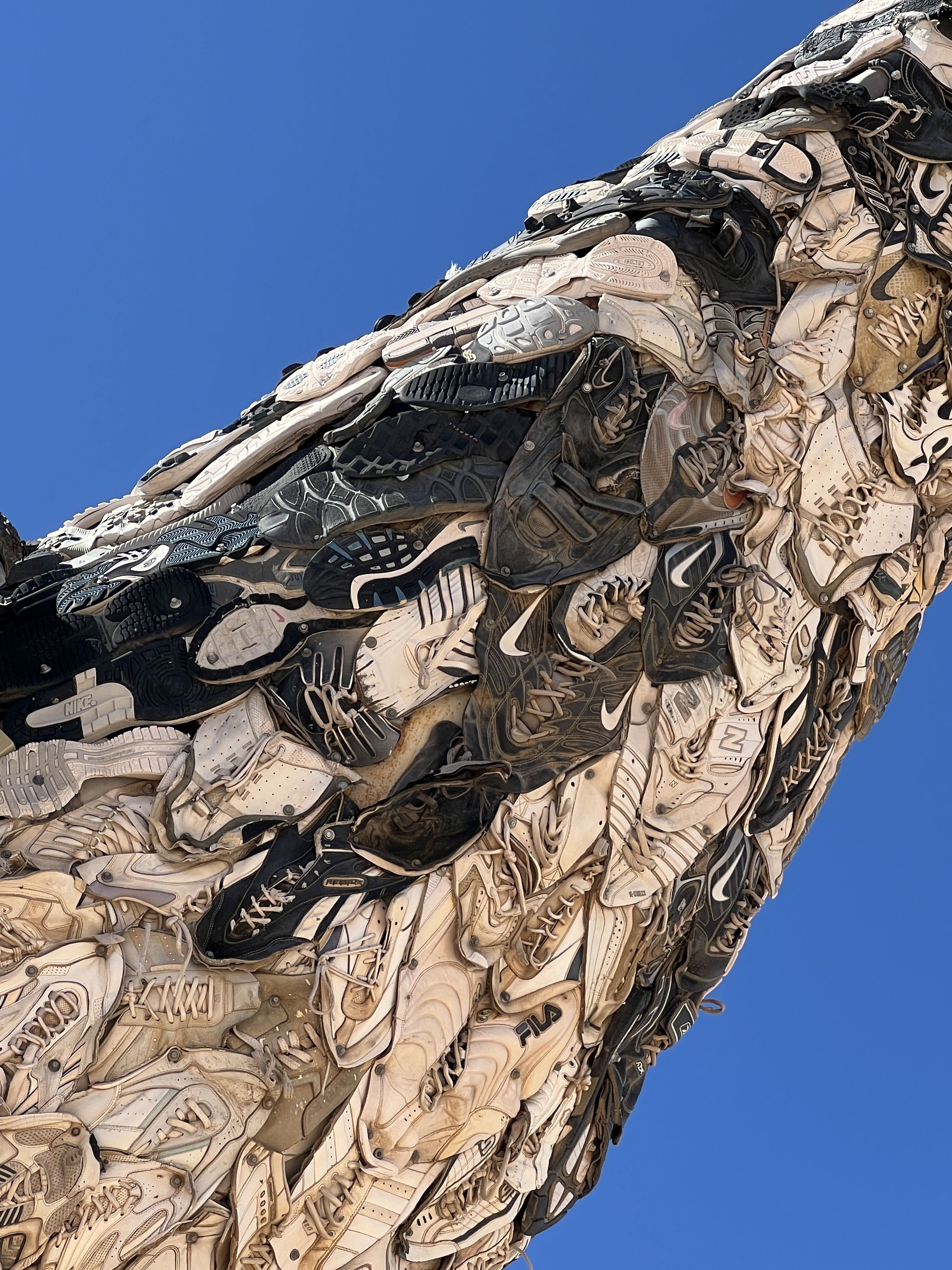 The legs are salvaged steel rods, covered in tire treads. The “feathers” of the underbelly and neck are made from hundreds of pairs of sneakers.
