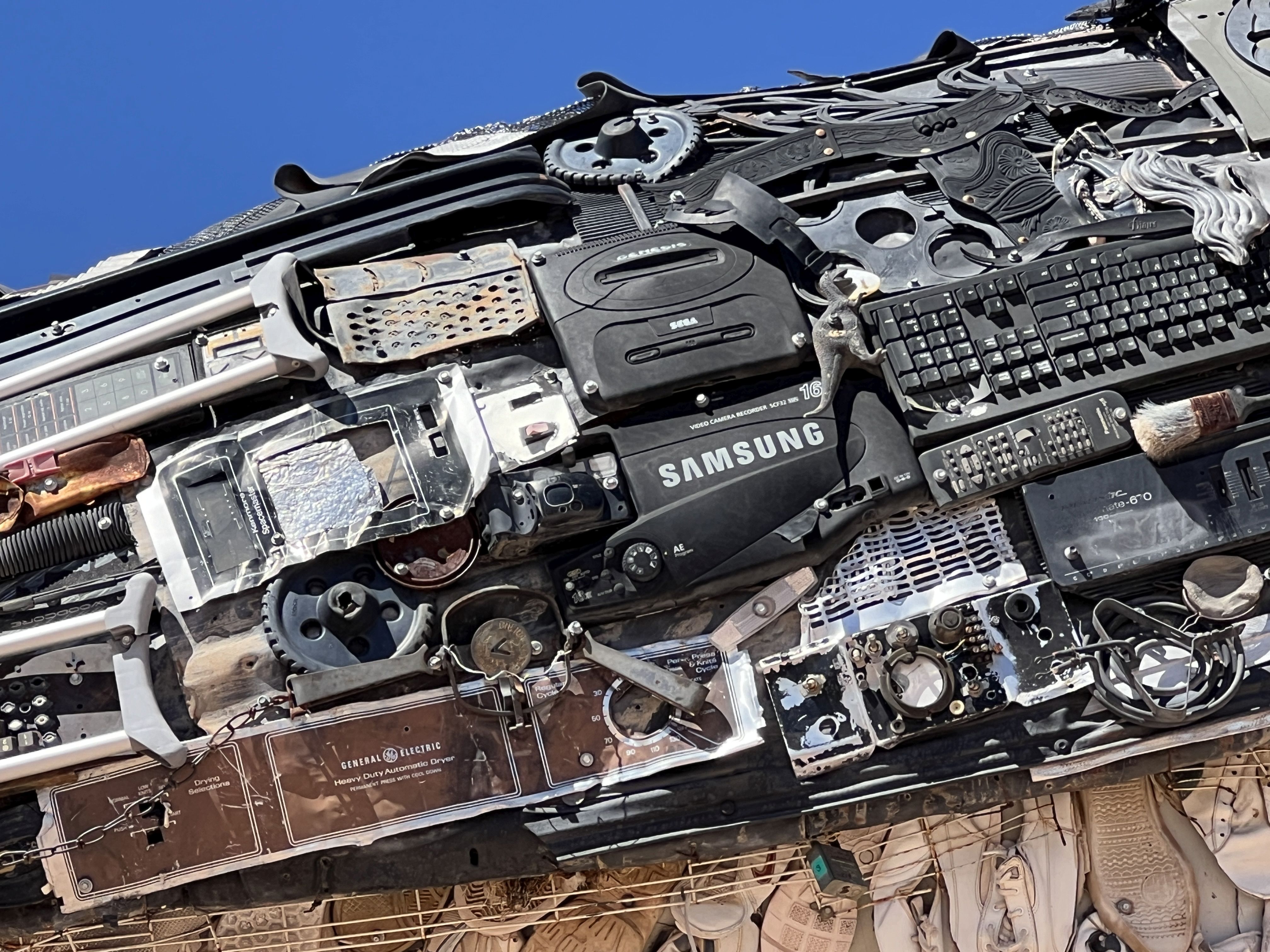 The body has electronic componets, TV remote controls, toys, merry-go-round horses, film spools, refrigerator radiators, computer keyboards, a gun holster, and more.