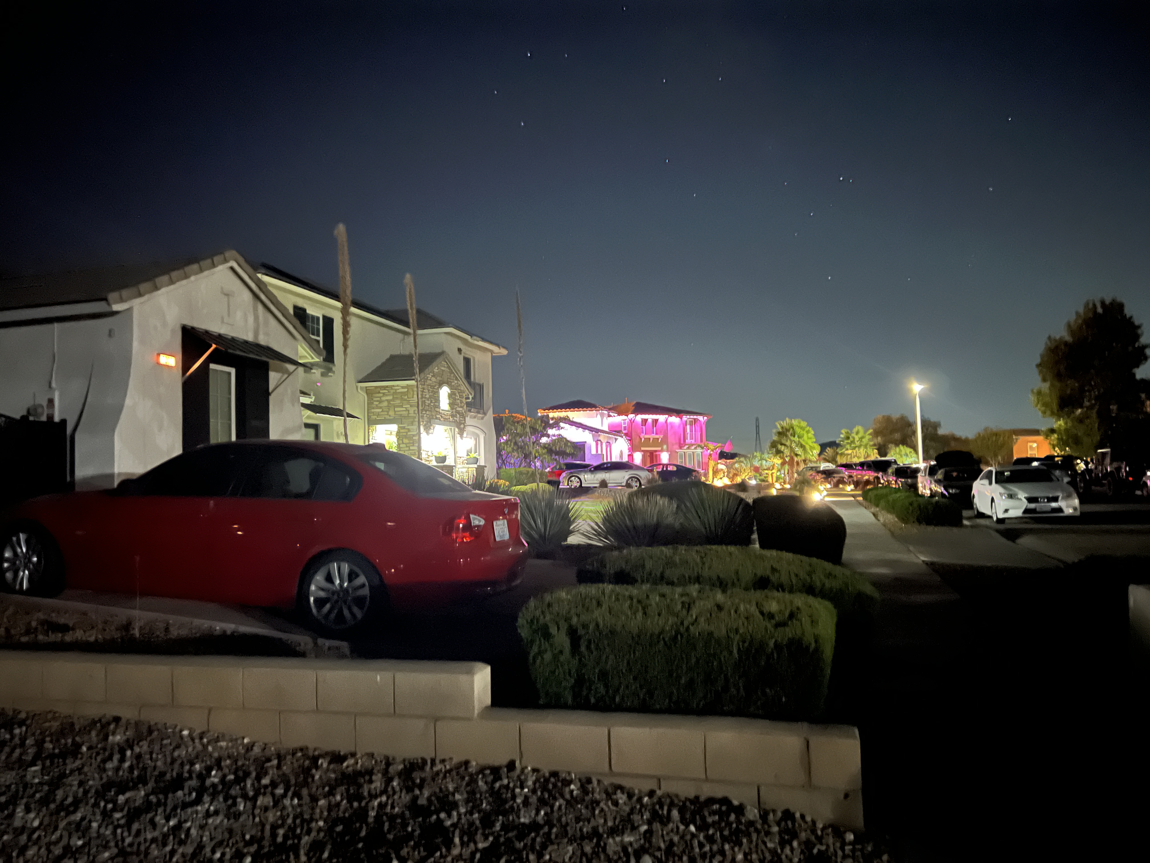 I had no idea they were there since I just had looked at the photo on my phone before now. You can clearly see the tail of Scorpius on the right above the street light – the two stars close together are Shaula & Lesath, with the “tail” curving down and then up to the right-top corner. To the left of Scorpius, at the top above the pink-lit house, you can clearly see the entire “teapot” of Capricorn. HOLY GUACAMOLE, BATMAN!!! Looking at the full-sized image, there’s a light spot in between the left of the tail of Scorpius and the right side of the “teapot”, and it’s right where (see that tail of Scorpius link a couple lines up, it will take you to a map!) the M7 star cluster is! Did I somehow manage to capture that in this image?!