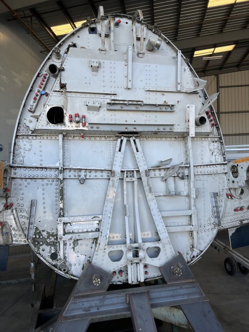 Our F8F Bearcat is undergoing a major overhaul. The engine is off completely, along with a number of other chunks. Here’s the firewall, forward of the cockpit, to which the engine mount, engine, a half gazillion parts, the cowling, and pretty much the whole pointy end of the plane will be attached.