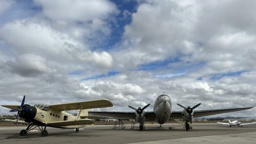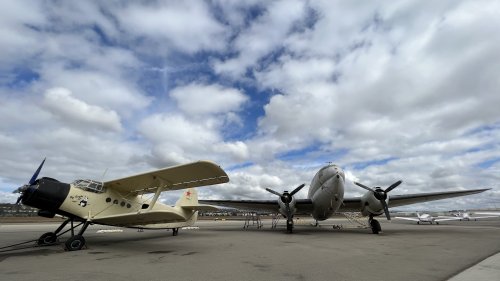 From left to right: The aforementioned “new” hangars, PBJ (gray bomber), F6F Hellcat (dark blue fighter), someone’s Cessna (white plane behind the F6F), YAK-3 (gray/blue camouflage fighter), AN-2 (huge yellow biplane), C-46 (silver cargo plane), MIG-17 (red jet), SNJ (yellow trainer), jeep & trailer.